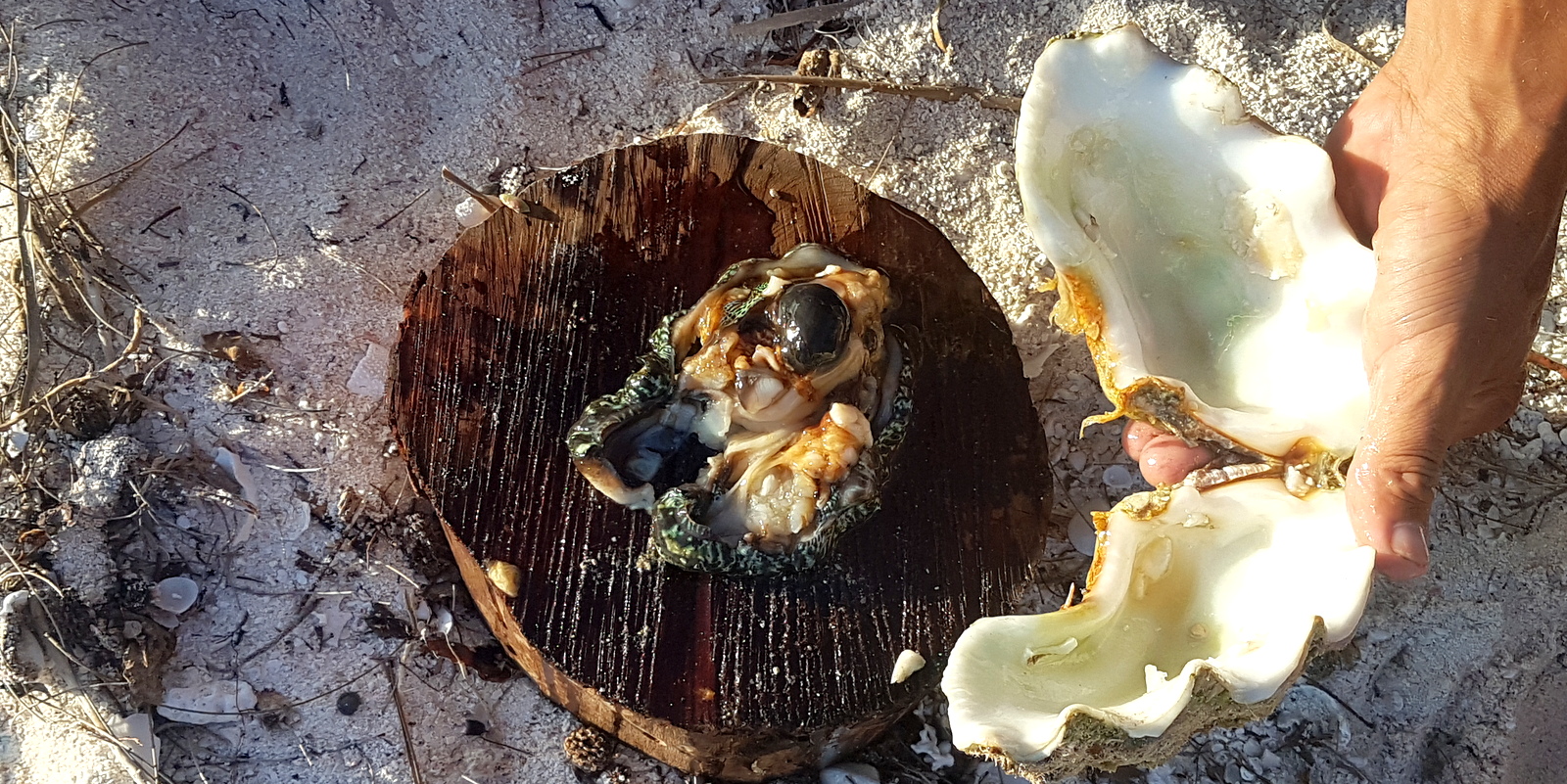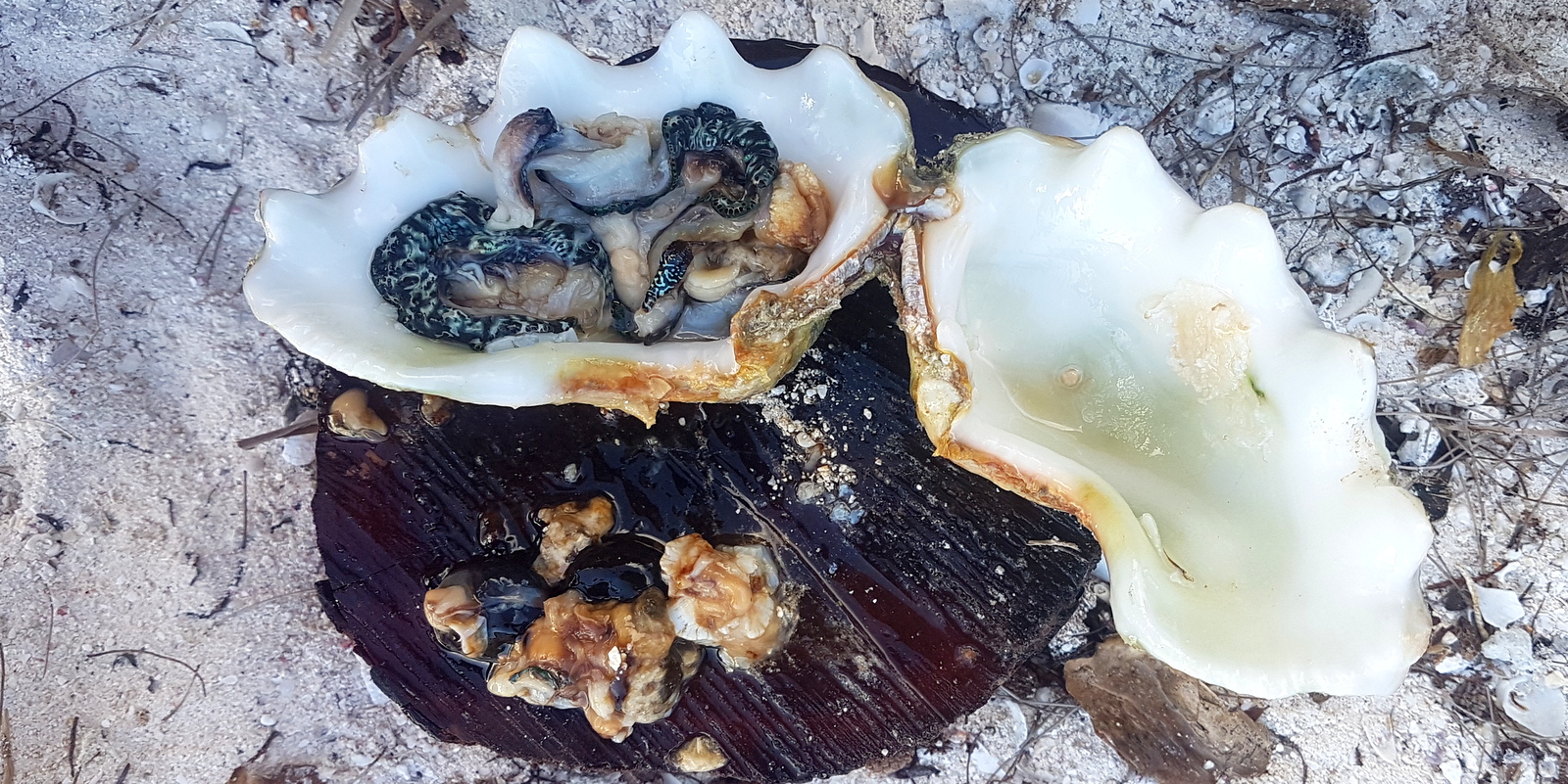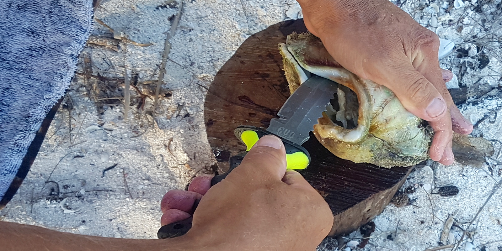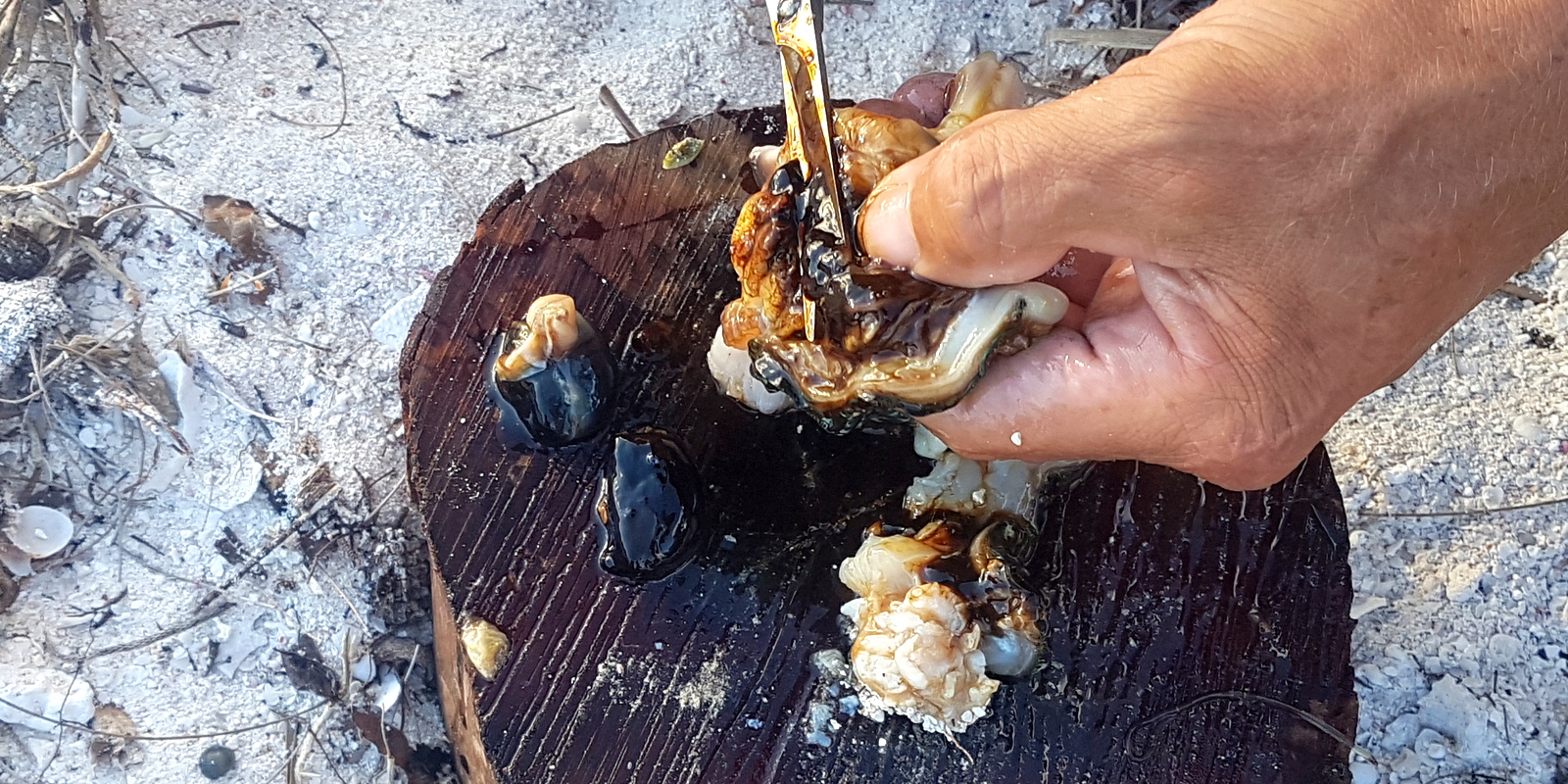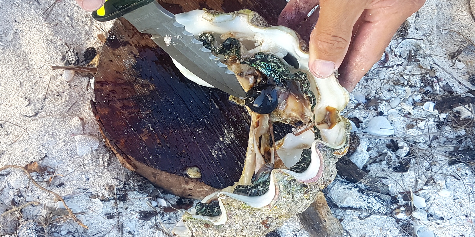 – une fois revenus au campement, il faut les ouvrir en coupant les 2 ligaments élastiques qui retiennent les valves du coquillage fermé. Il faut donc retourner le bénitier et enfoncer un couteau dans l’ouverture du pied central (photo 2).