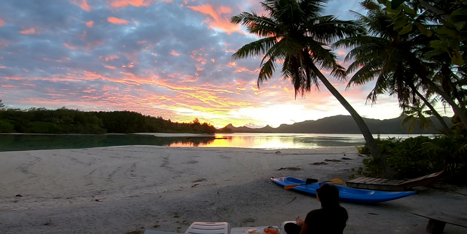 De retour au camp sur notre motu, on reprend nos activités désormais quotidiennes: pêche aux bénitiers, préparation de cocos, vaisselle avec du sable (très efficace), balade en kayak… En début d’après-midi, le bateau arrive avec notre ravitaillement du jour et on ne le reverra que le lendemain en début de soirée pour ramener à la pension sur l’île principale…