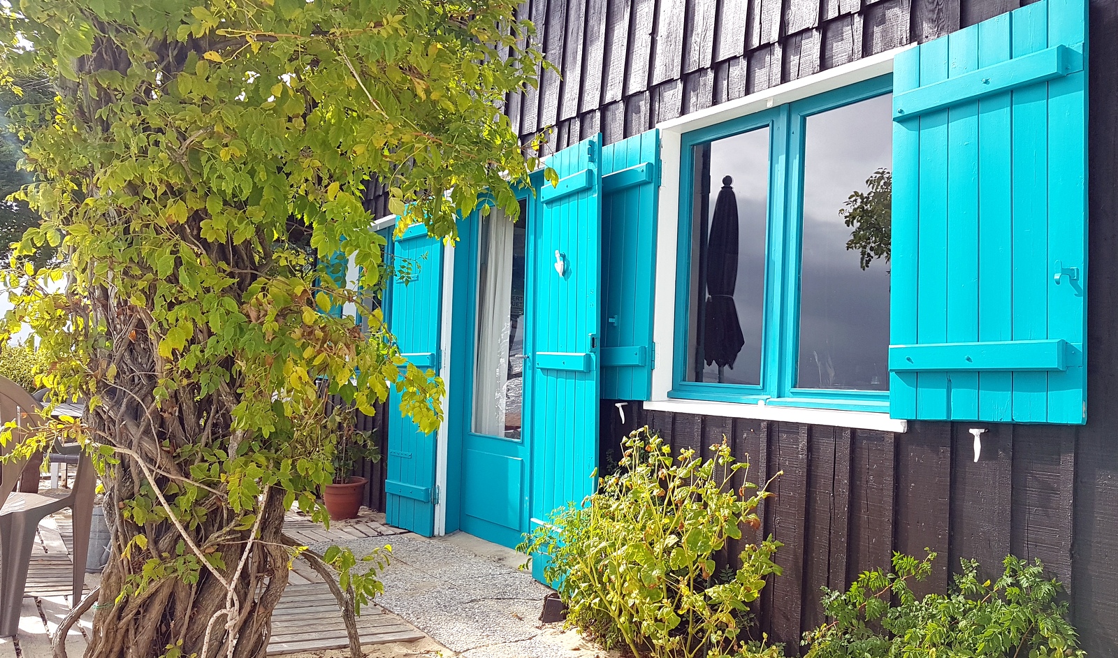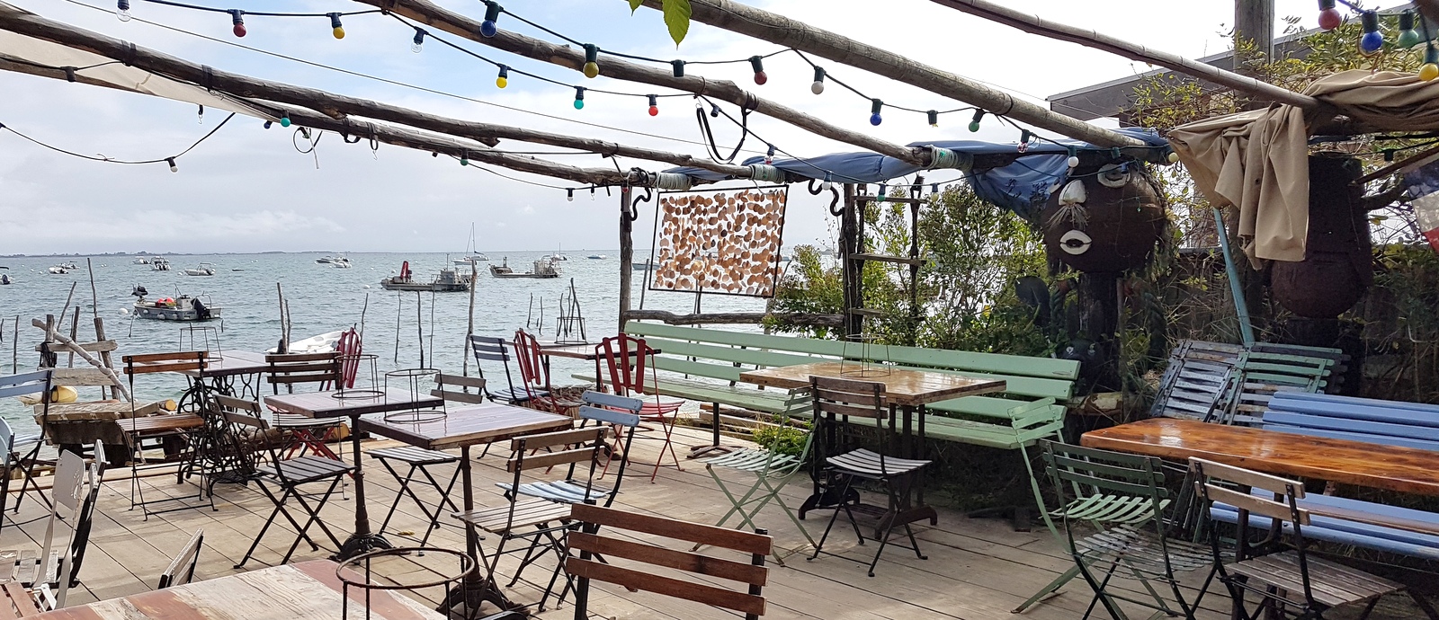 Une cabane ostréicole à l’esprit brocante, avec chaises et tables dépareillées, de drôles de sculptures en métal… sur une terrasse donnant sur le bassin. Mon coup de cœur malheureusement exceptionnellement fermé lors de notre passage…