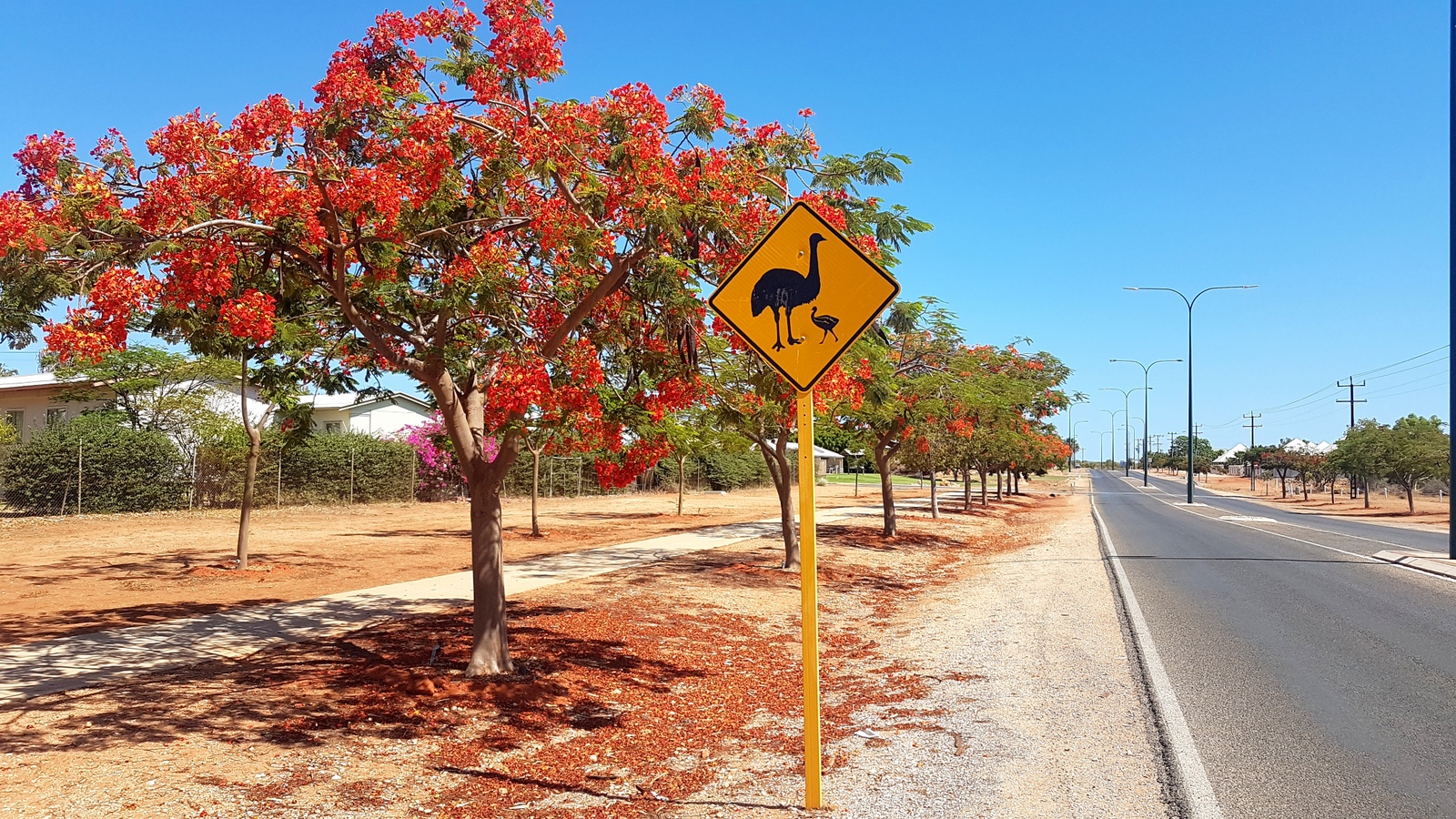On est accueillis par une allée de flamboyants en fin de floraison et des émeus! Même si on est prévenus dès l’entrée dans la ville par des panneaux, c’est vraiment étonnant d’en voir autant se balader librement sous le regard indifférent des habitants…