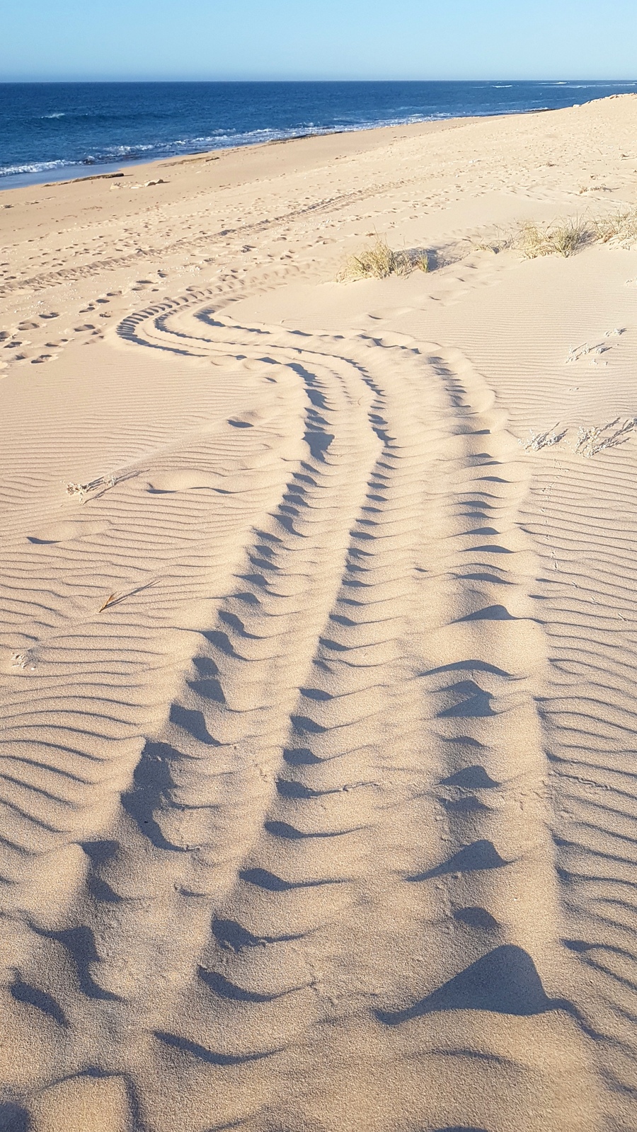 Moins de chance à Exmouth puisqu’elles n’étaient pas au rendez-vous le soir où on y était! Pourtant tous les voyants étaient au vert d’après les locaux: bonne période, marée montante et pleine lune… Il y avait des traces de leur passage partout sur la plage mais pas de tortues… et le centre était fermé, on s’est donc contenté d’un magnifique coucher de soleil!