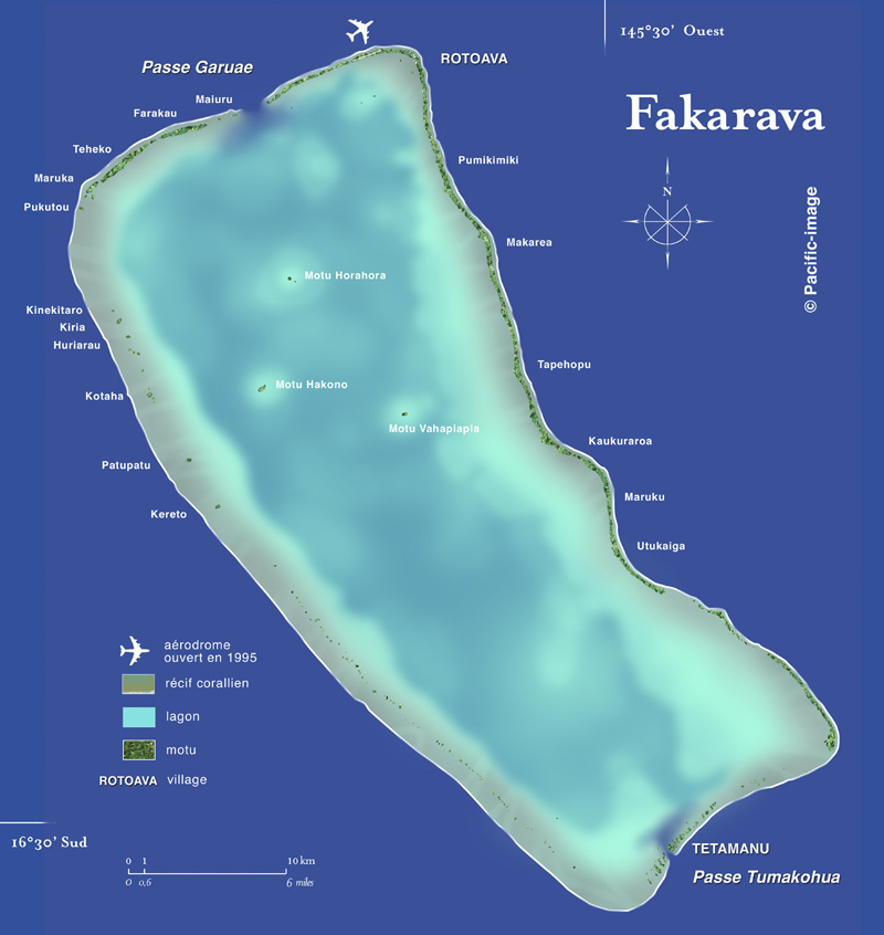Fakarava, qui est situé à 450 km au nord-est de Tahiti, fait partie de l’archipel des Tuamotu nord comme Rangi. C’est le 2ème atoll de Polynésie par sa superficie: 60 km de long sur 25 km de large! L’atoll possède 2 passes : Garuae (au nord), la plus grande passe de la Polynésie Française ( 1,6 km de large) et Tamakohua, appelée aussi Tetamanu (au sud).