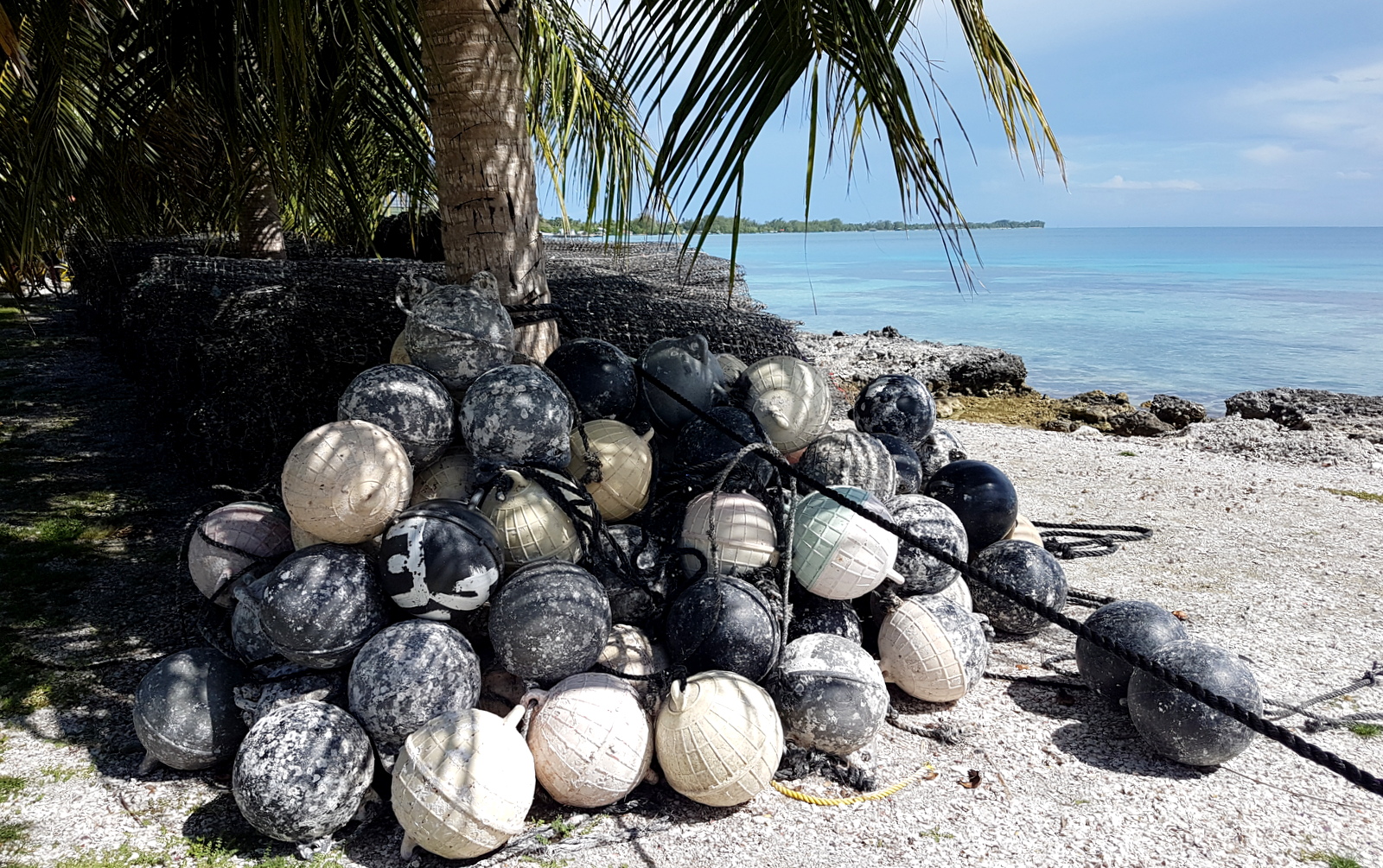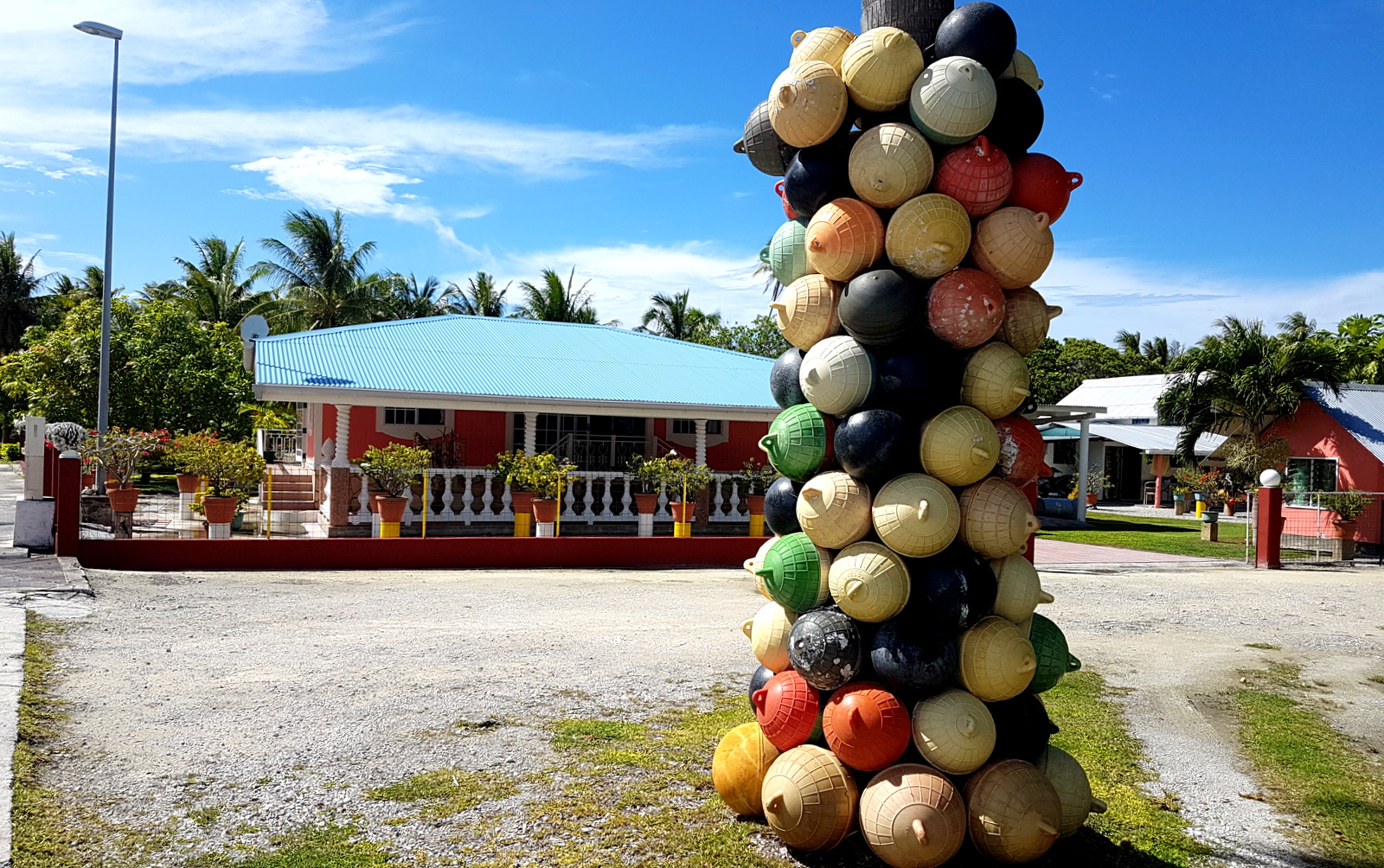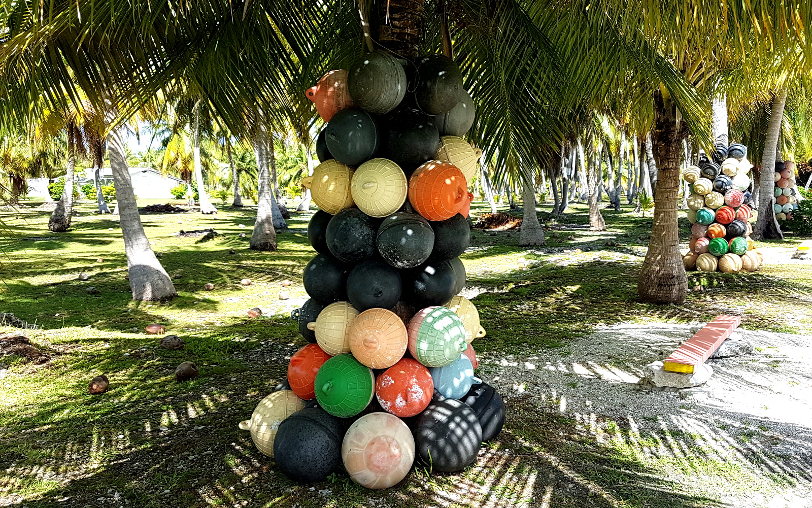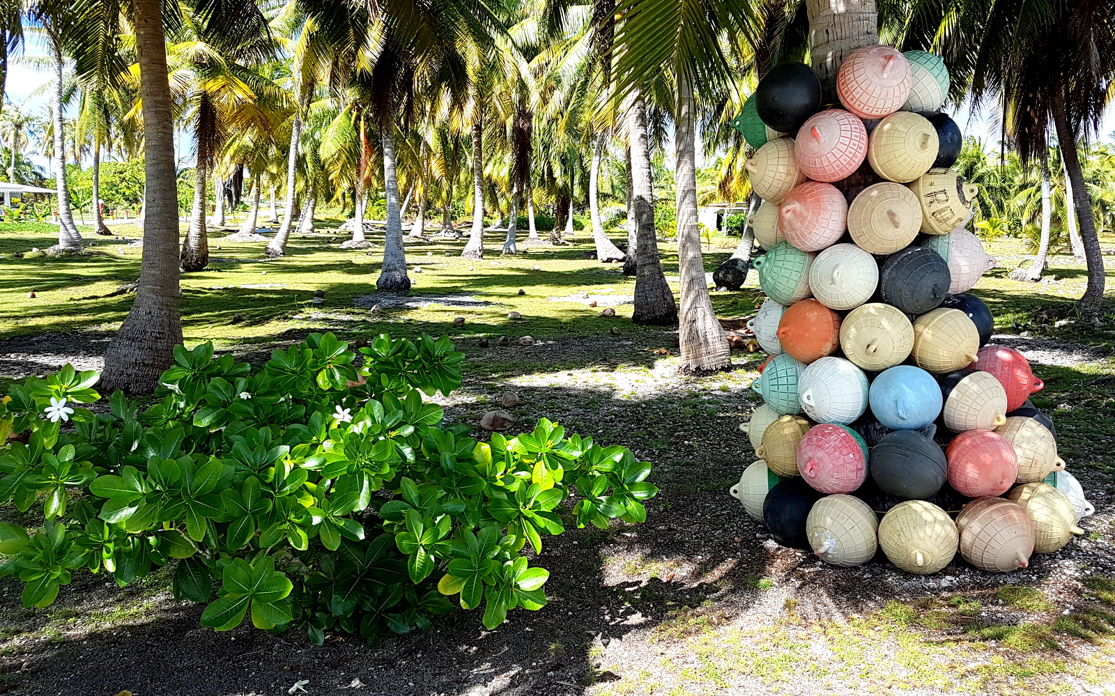 A peine pris la route dans le van d’Isabelle pour rejoindre la pension qui est une des plus éloignées de l’aéroport que nous sommes agréablement surpris par l’aspect coquet de l’île par rapport à Rangiroa. Les bords de la route qui longe un lagon d’un magnifique bleu sont bien entretenus… Nous traversons le village de Rotoava, le principal village du motu où vivent la majorité des 855 habitants de l’île. Les maisons sont jolies, colorées, fleuries et un bel arrangement d’anciennes bouées de fermes perlières donne un air très décoratif… L’église aux murs en chaux de corail blanc éclatant fait un joli contraste sur le bleu azur du ciel…