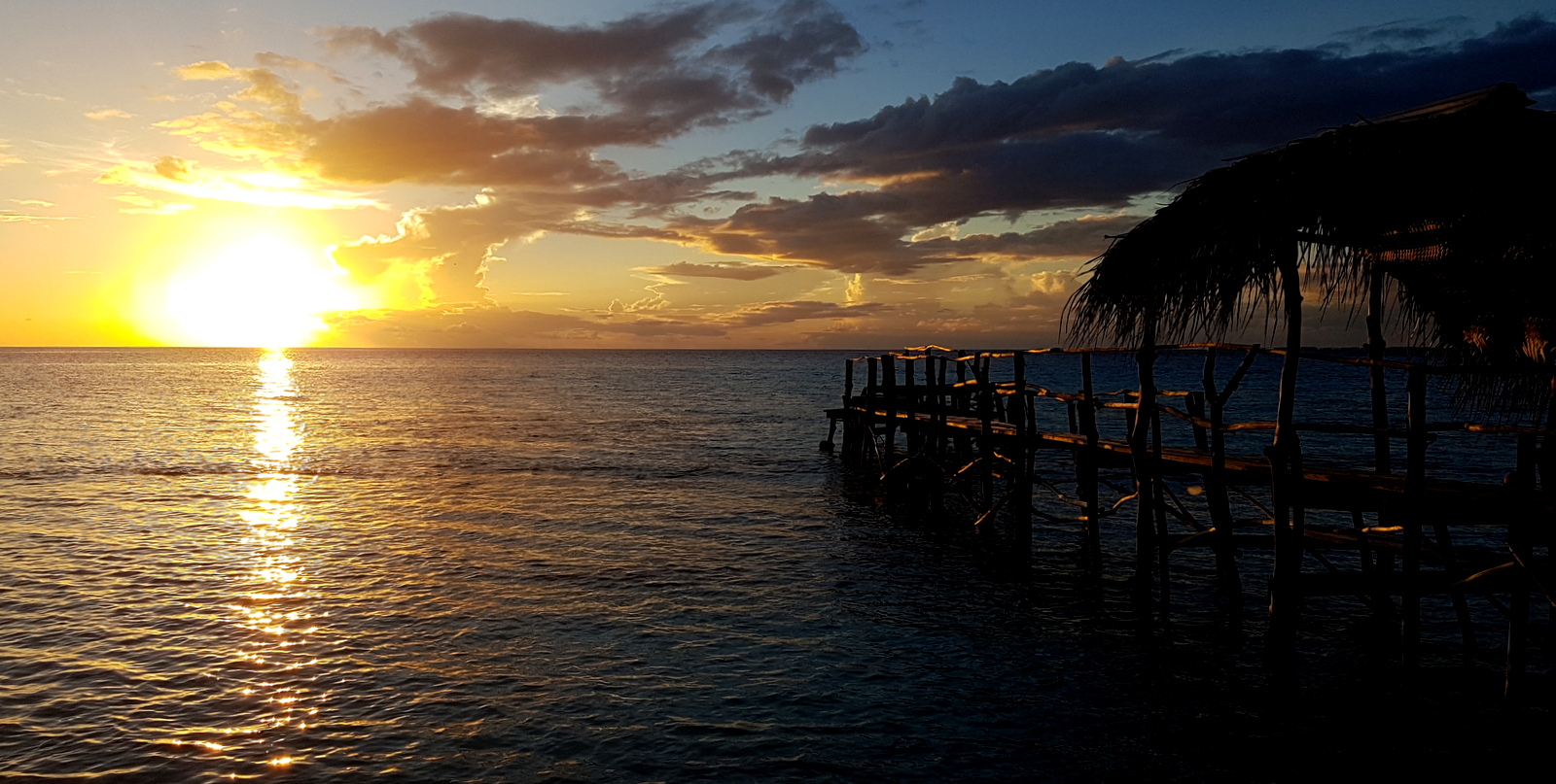 Le bungalow est bien agencé avec un grand lit (queen size) équipé d’une moustiquaire. Il y a une TV et un ventilateur sur pied. Seuls reproches: le manque d’un frigo et d’une bouilloire pour avoir des boissons chaudes et la connexion internet très capricieuse qu’on ne peut obtenir que près du bureau d’accueil !!! Et comme pour nous souhaiter la bienvenue, nous assisterons ce premier soir à un coucher de soleil fantastique sur le ponton en bois juste devant…