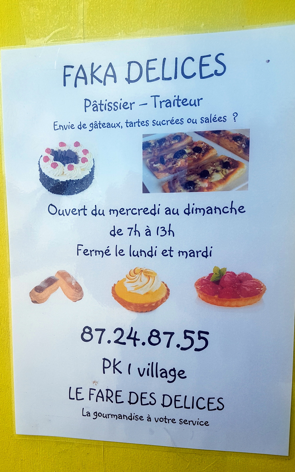 FAKA DELICES a récemment déménagé et se situe maintenant en plein centre du village à côté d’un magasin de vêtements. Ses tartines et quiches épinards-fromage ainsi que ses desserts sont délicieux… Parfait pour un repas léger ou un petit creux après la plongée!!!