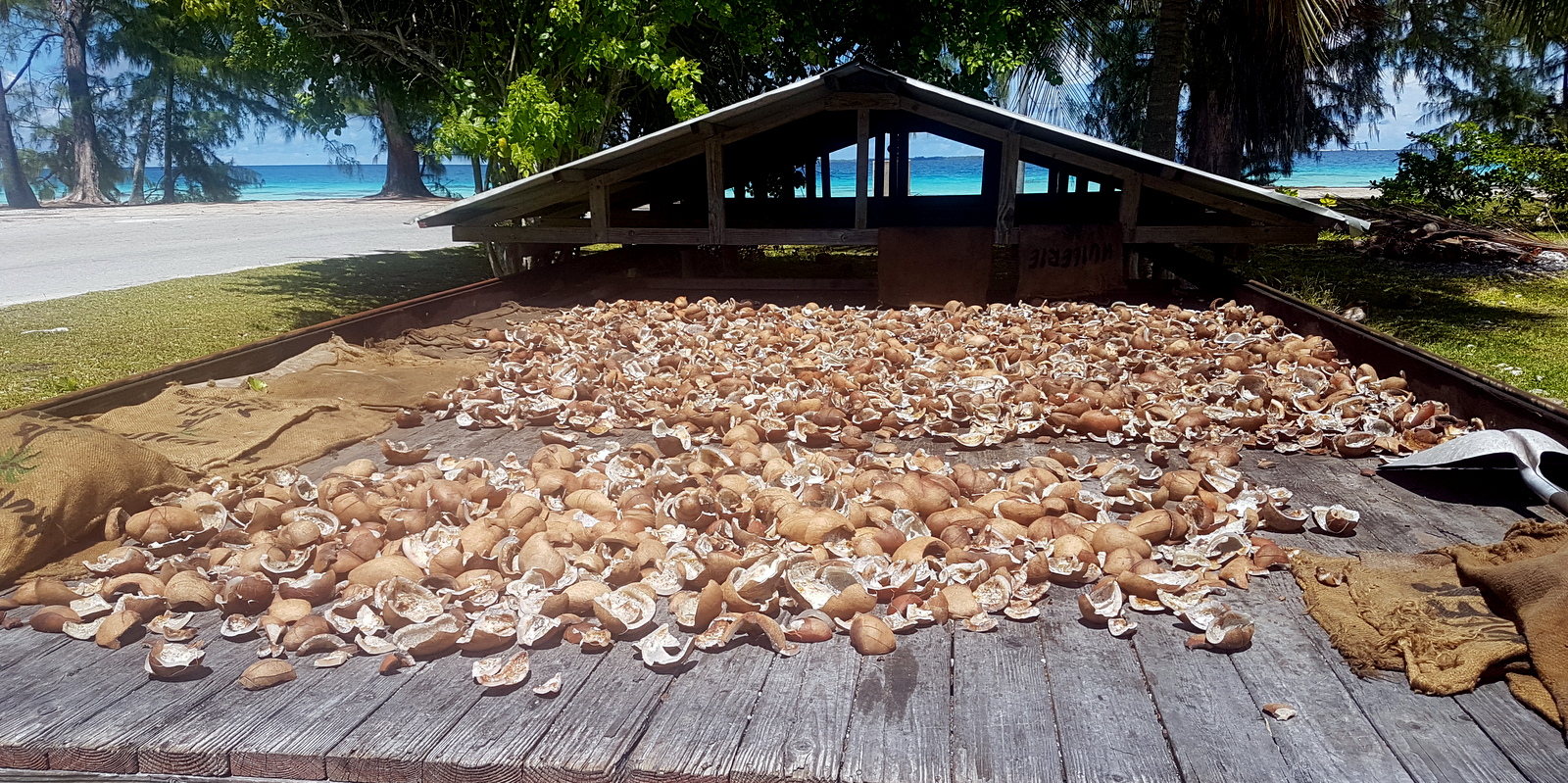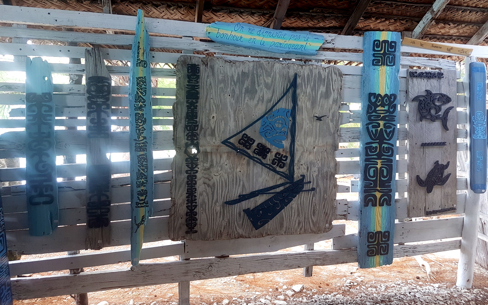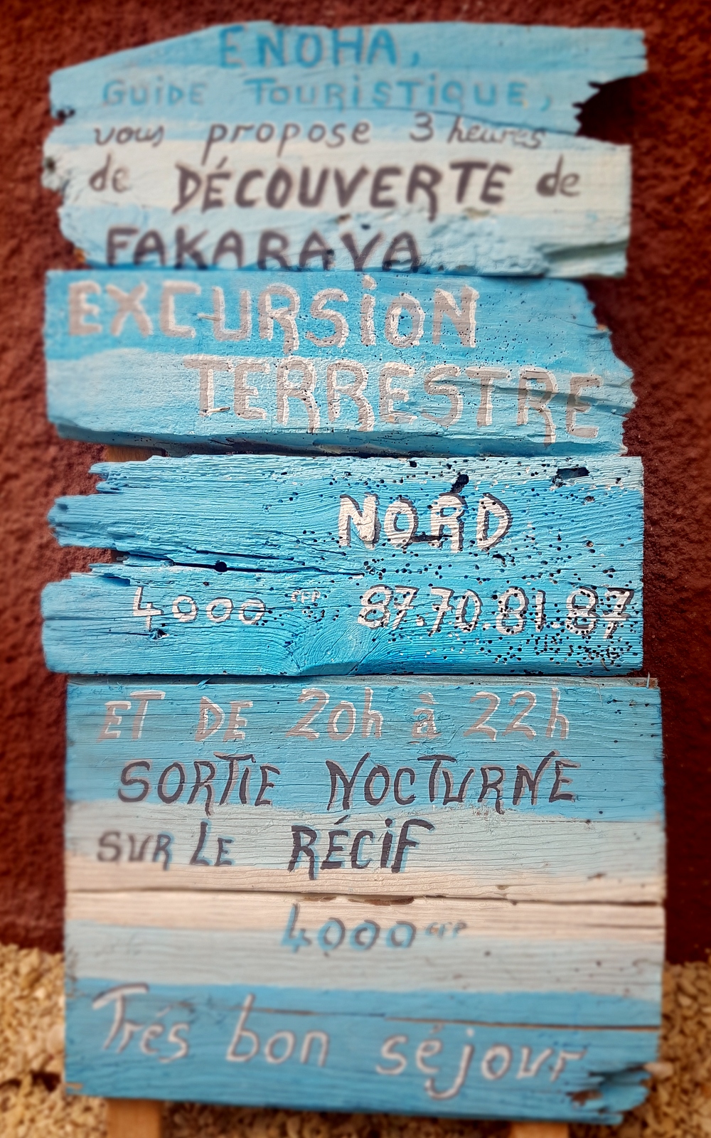 Pour découvrir le reste de l’île, j’ai préféré faire appel aux services d’Enoha de FAKARAVA TOUR, le seul guide sur Fakarava. Il propose une visite de 3h (minimum)pour 4000 CFP/personne pendant laquelle il nous enseigne la flore et ses propriétés médicinales, les coutumes locales, l’histoire de l’île…On visite une fabrique artisanale d’huile de coco où on peut acheter, entre autres, une huile de coco alimentaire parfumée au basilic polynésien parfaite pour les salades, le village, l’ancien phare de Topaka (qui sera bientôt détruit malheureusement!), la fameuse plage « carte postale » proche de la passe nord, la passe nord… et pour finir, la boutique d’art qu’il a créé avec sa femme Cécile: ART NATURE qui se situe au PK 1,8 à la sortie du village entre l’Havaiki Lodge et La Paillote. Si vous aimez les créations en bois flotté, coquillages et tout ce qui vient de la mer, vous y trouverez forcément votre bonheur…