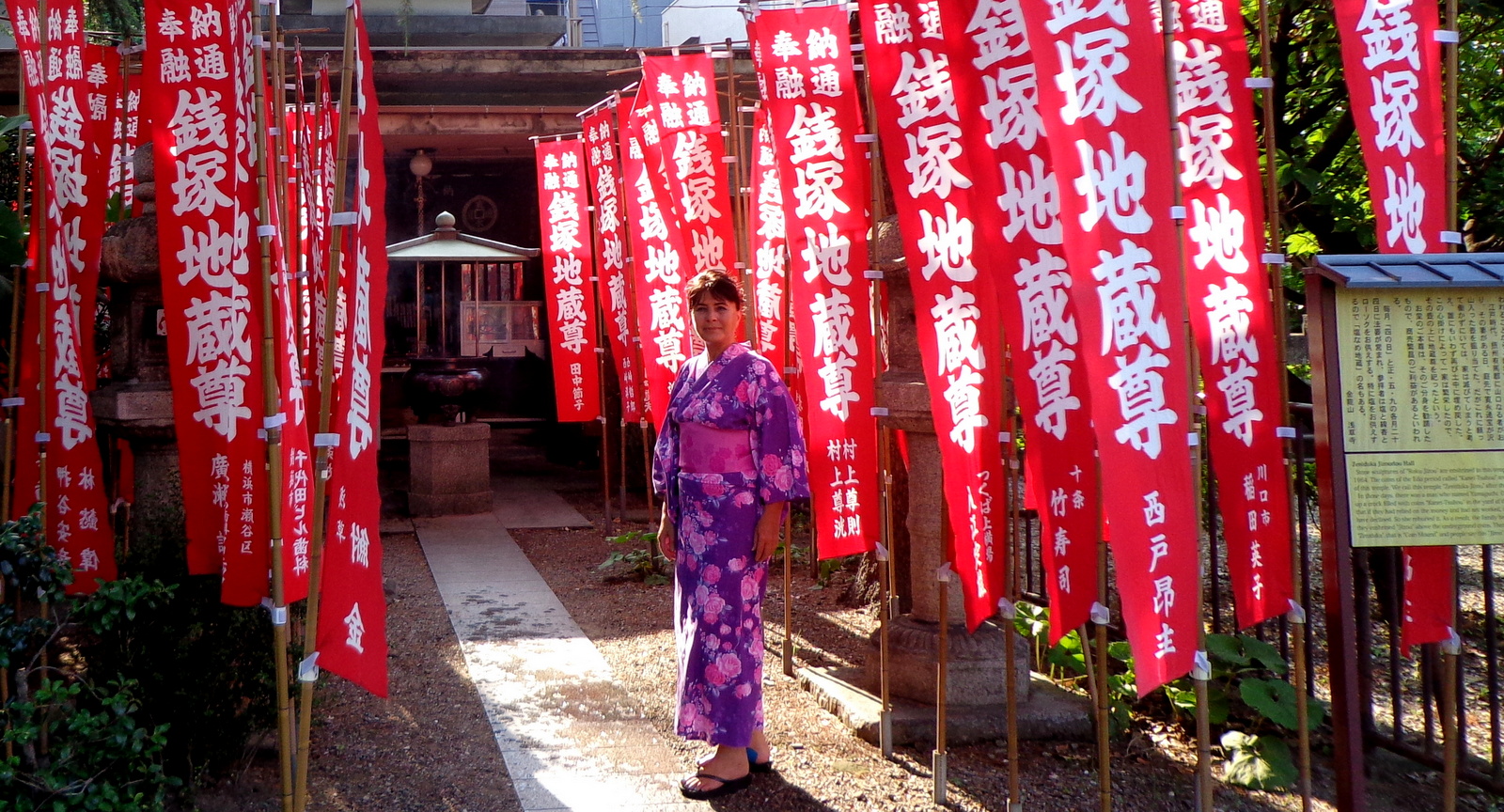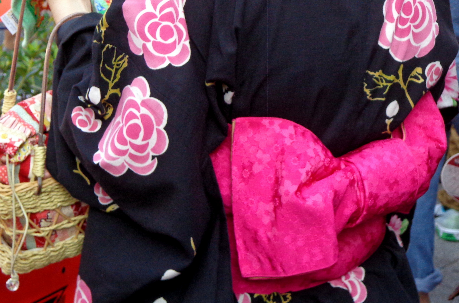 Personnellement, ayant la cheville strappée suite à une entorse, j’ai zappé les geta pour rester en tongs mais de couleur assortie au kimono !!! Je vous conseille d’ailleurs de faire la même chose car les geta, c’est très « casse-gueule » quand on n’a pas l’habitude et il faut beaucoup marcher, monter et descendre des marches dans les stations de métro…