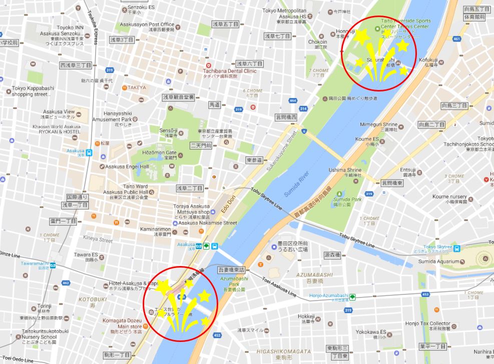 L’heure du lancement du feu approchant, il sera de plus en plus dur de pouvoir prendre ces lignes car les queues pour accéder aux trains sont interminables. Il peut donc être judicieux de s’arrêter à une station proche sur une autre ligne: Oshiage Station, Narihirabashi Station, Tawaramachi Station , Ryogoku Station ou Kuramae Station et ensuite continuer à pied… car on peut facilement attendre plus d’une heure pour pouvoir approcher la plateforme du train !!!