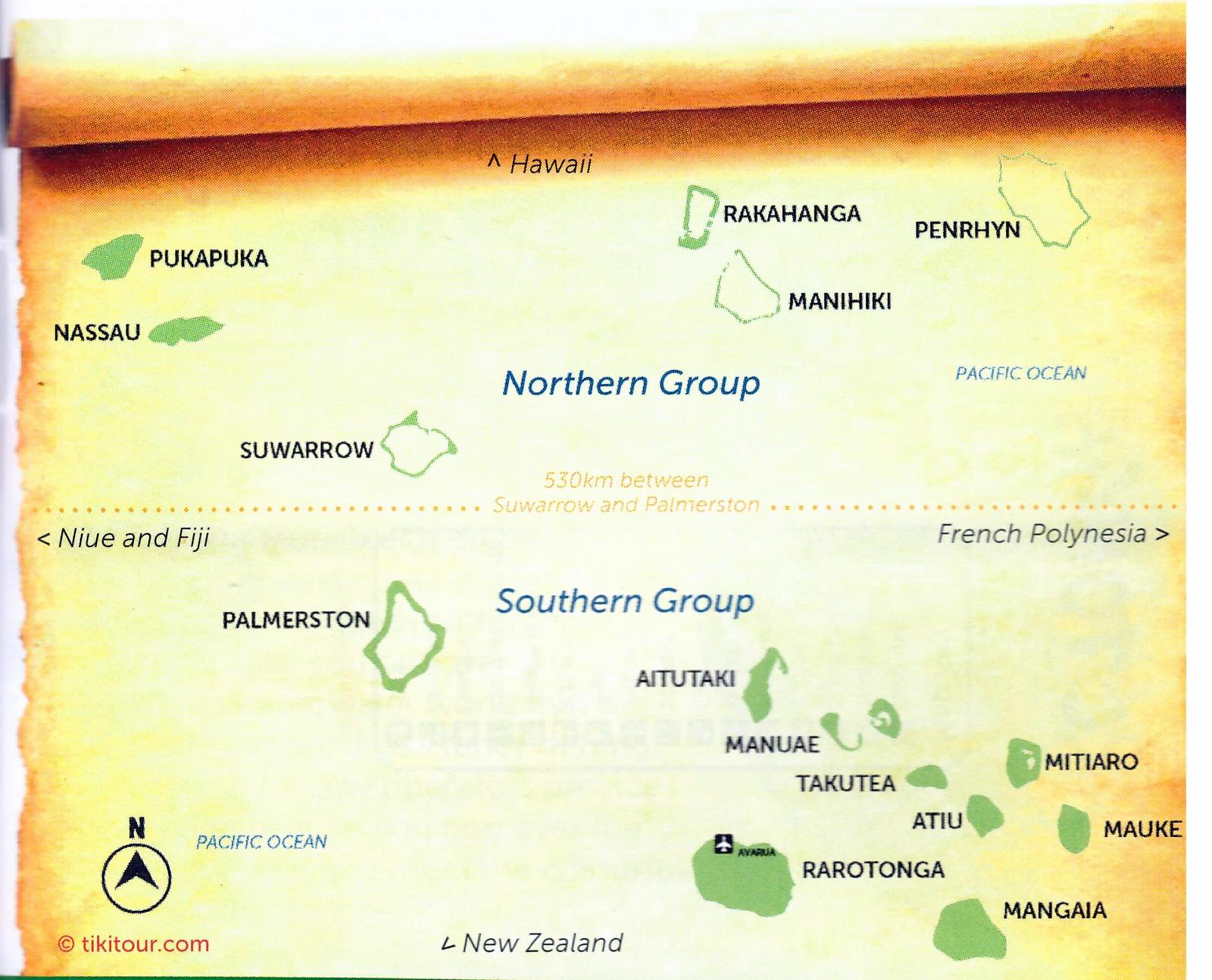 Les Iles Cook réunissent 15 îles, celles du groupe nord: Pukapuka, Nassau, Rakahanga, Penrhyn, Nalihiki et celles du sud: Palmerston, Aitutaki, Manuae, Takutea, Mitiaro, Atri, Atiu, Mauke, Mangaia et Rarotonga.