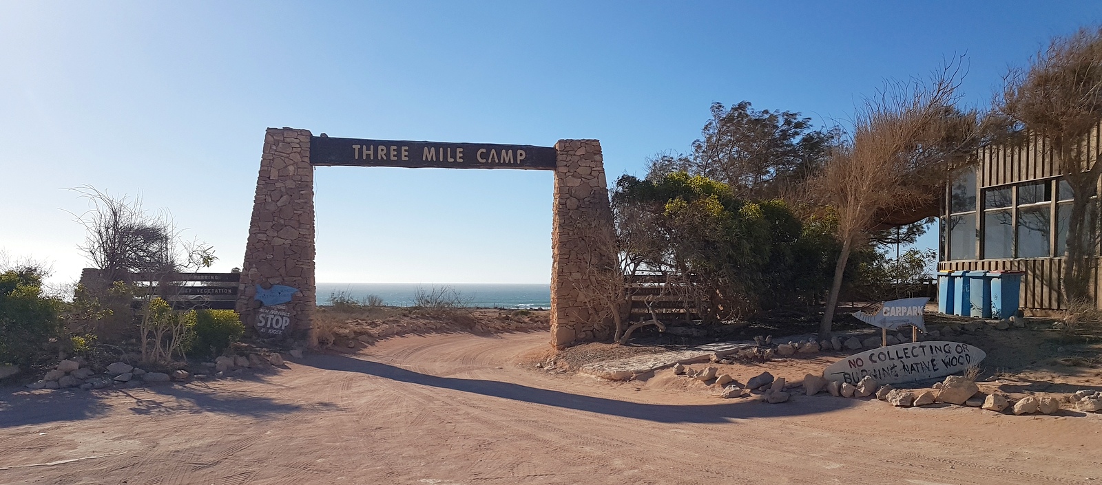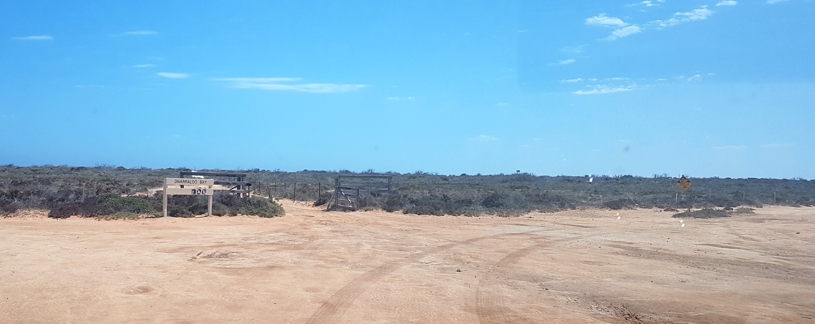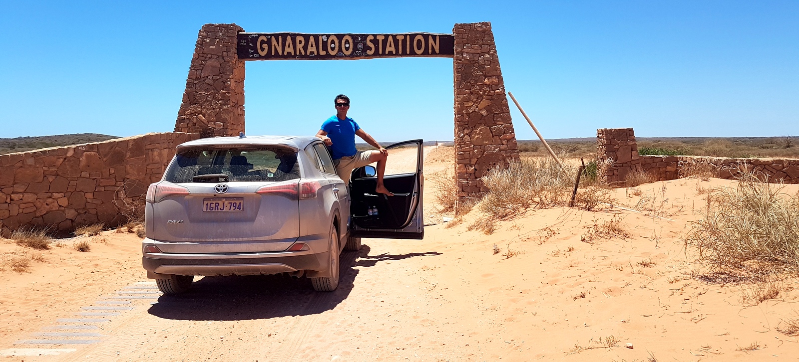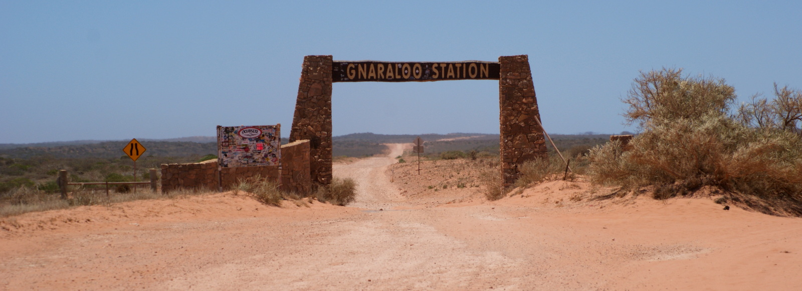 C’est au Red Bluff que commence le Ningaloo Reef et peu après Gnaraloo Station matérialisée par une arche en pierre au dessus de la piste…