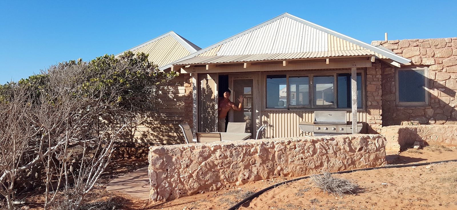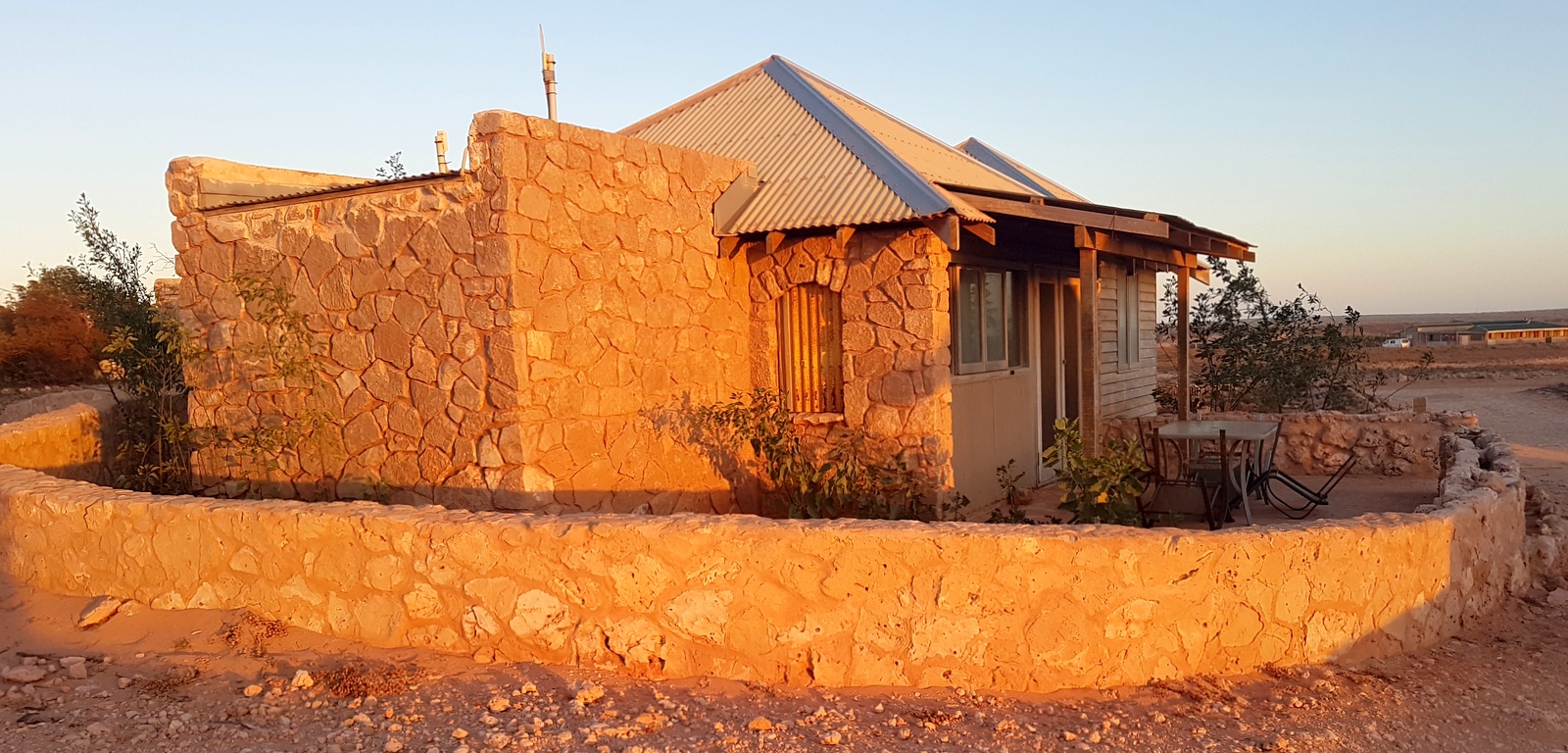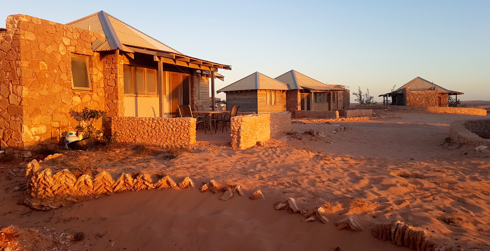 Le bungalow est un chalet en pierres assez rustique. Il est recouvert de poussière à l’extérieur, on ne voit pas grand-chose à travers les fenêtres mais l’intérieur est plutôt confortable même si le matériel est restreint… On a l’heureuse surprise de découvrir 2 frigos bien pratiques pour stocker tous les fruits et légumes qu’on a rapportés de Carnarvon et même un micro-ondes!