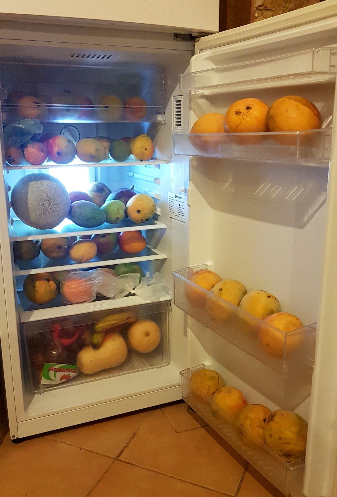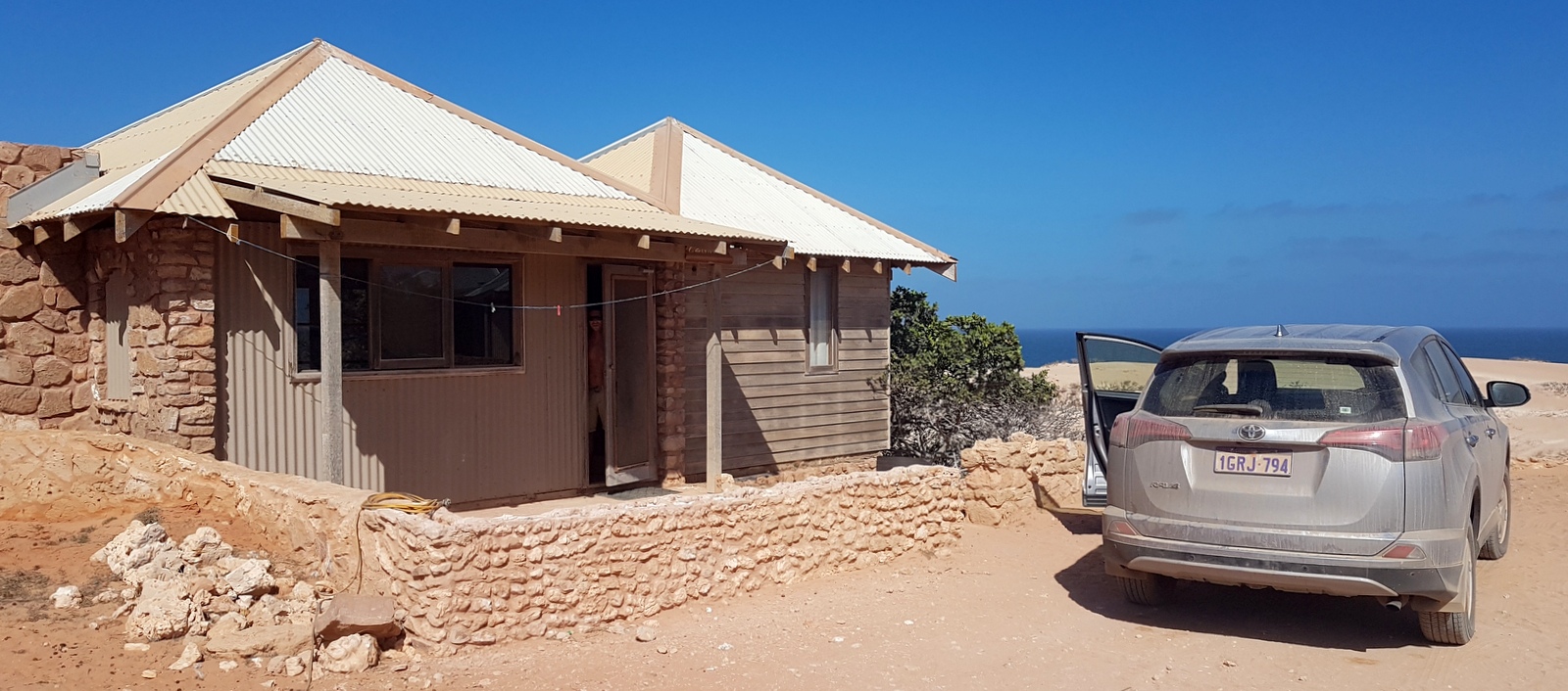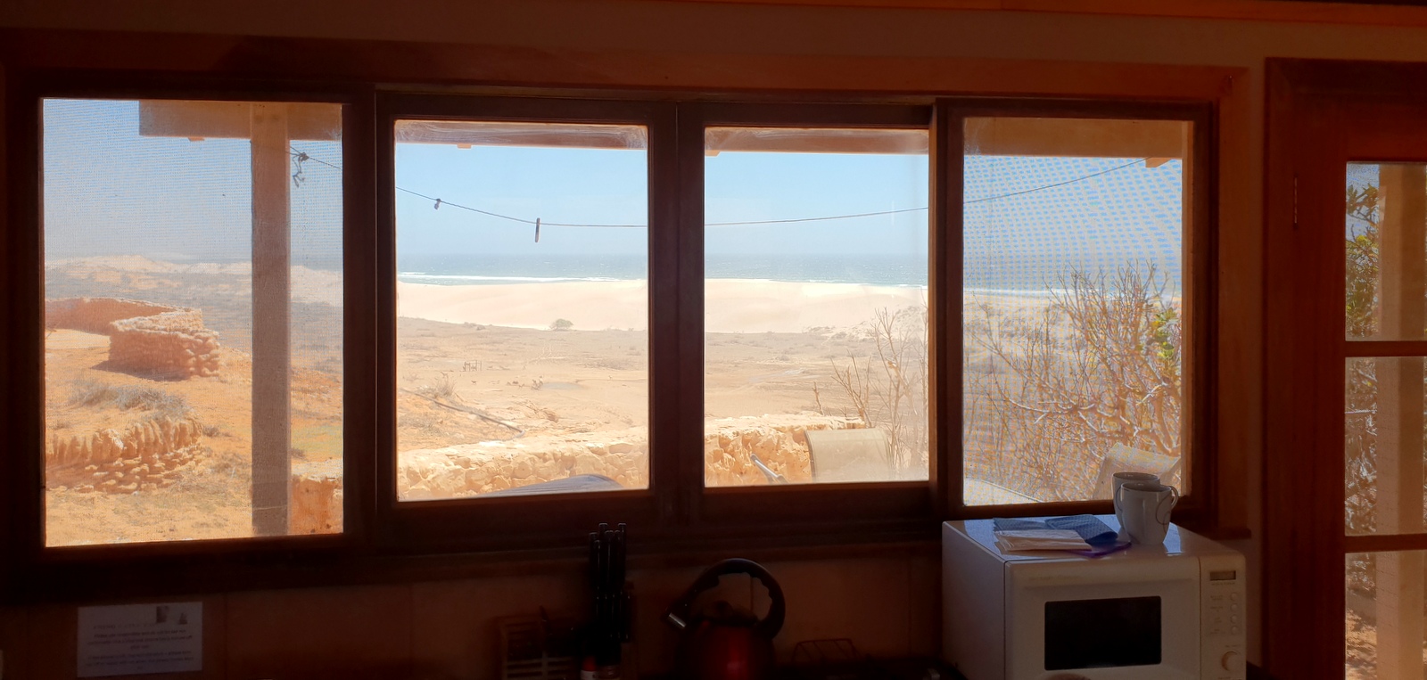 Le bungalow est un chalet en pierres assez rustique. Il est recouvert de poussière à l’extérieur, on ne voit pas grand-chose à travers les fenêtres mais l’intérieur est plutôt confortable même si le matériel est restreint… On a l’heureuse surprise de découvrir 2 frigos bien pratiques pour stocker tous les fruits et légumes qu’on a rapportés de Carnarvon et même un micro-ondes!