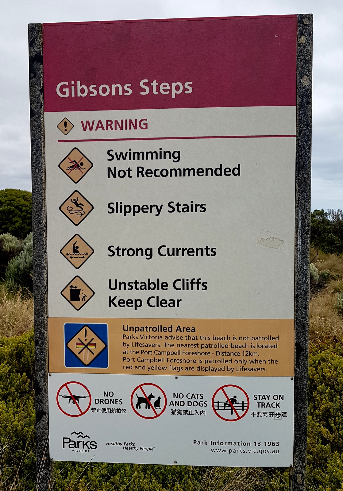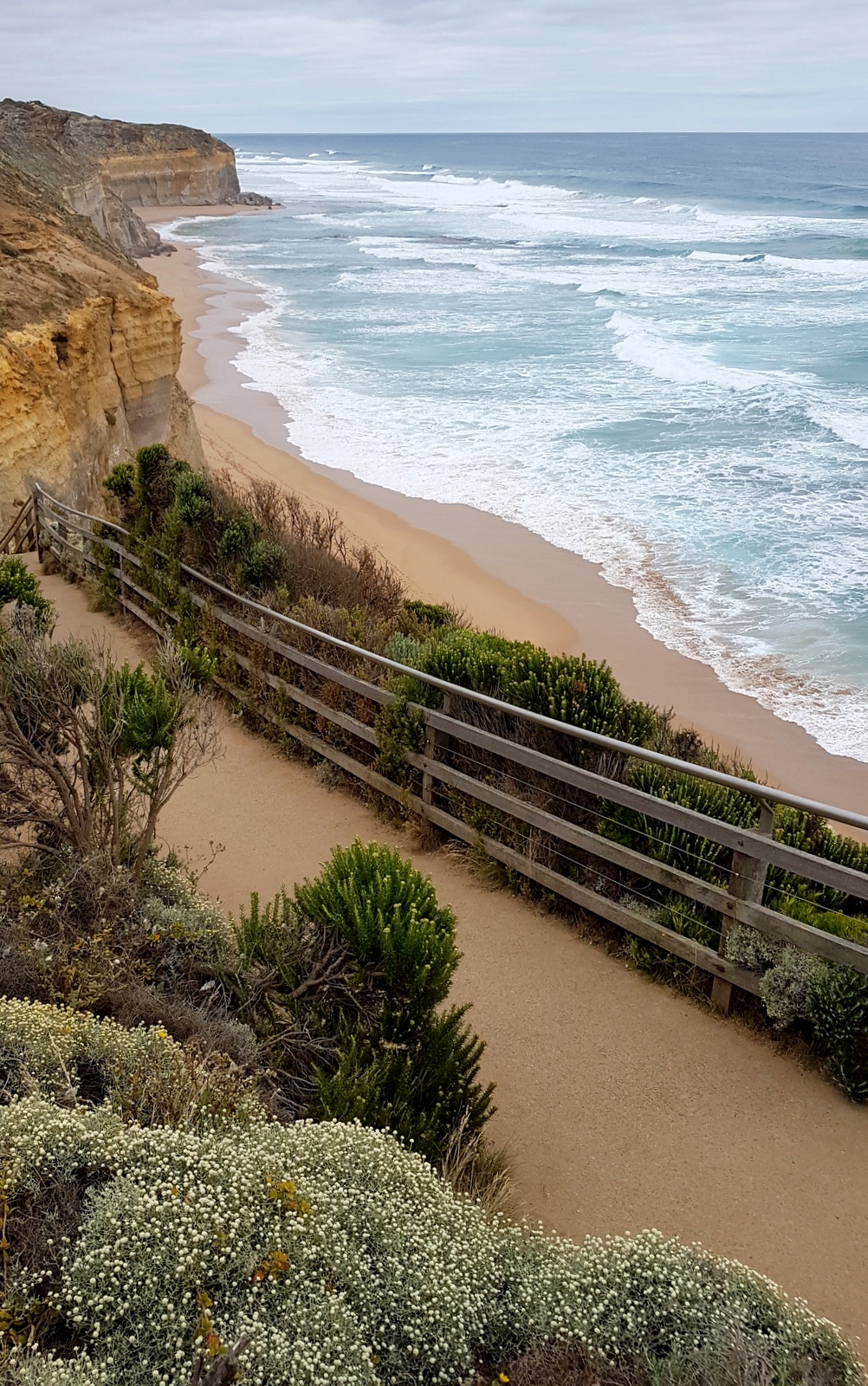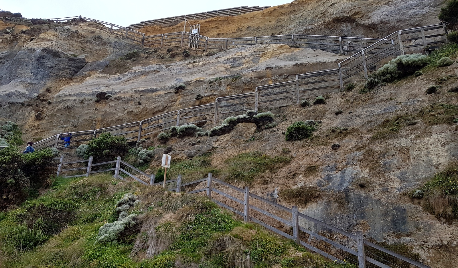 On doit revenir sur nos pas car les Gibson Steps se situent 1 km avant les 12 Apôtres. Arriver aussi tôt garantit également de pouvoir trouver à se garer sur le (petit) parking du site sinon il faut aller à l’immense parking des 12 Apôtres et parcourir à pied ce kilomètre sur un sentier balisé.