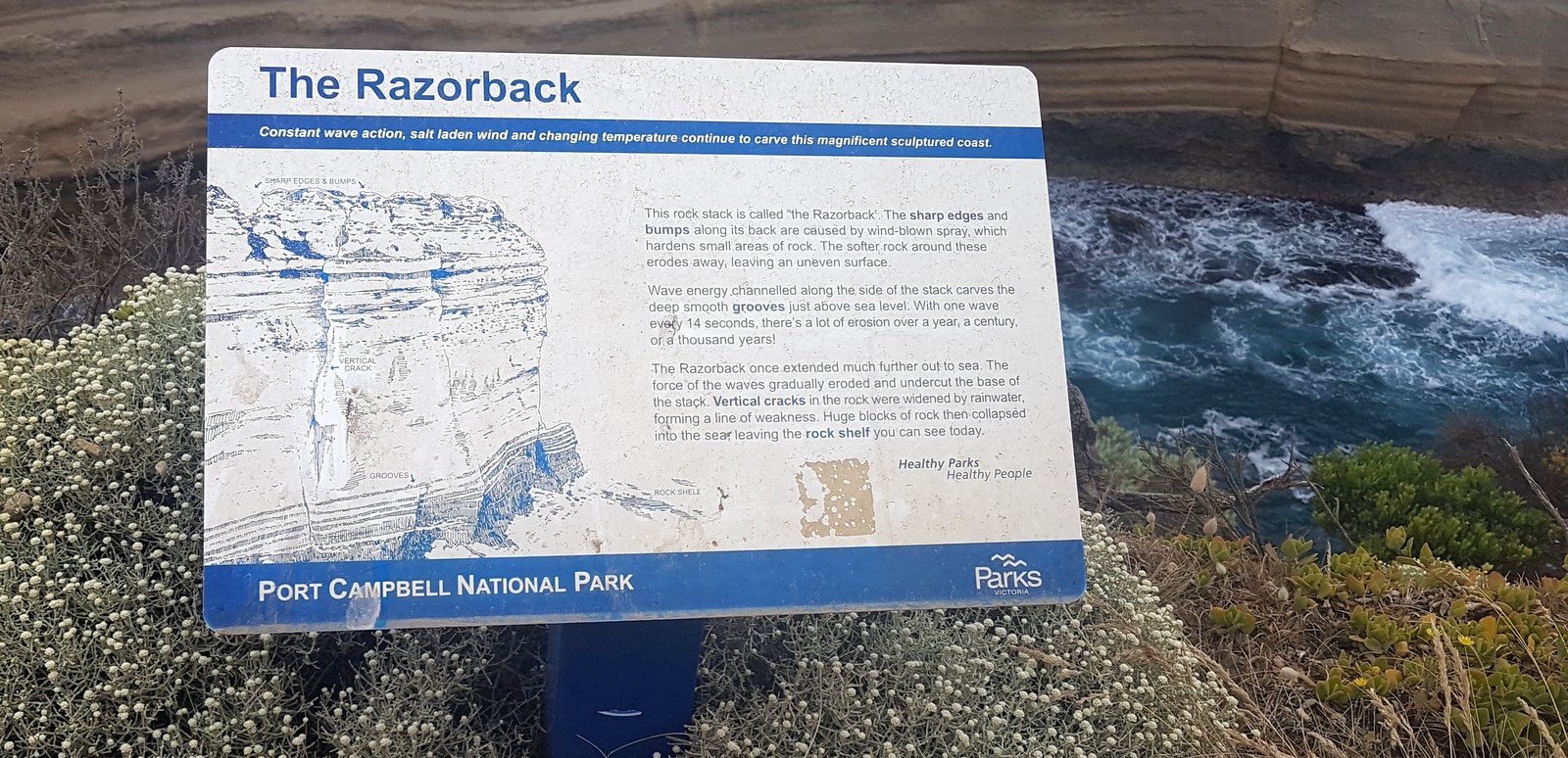 En continuant le chemin jusqu’au bout se trouve The Razorback, un énorme rocher tout en longueur qui s’élève à une douzaine de mètres. Autrefois, il s’avançait bien plus dans la mer mais les vagues qui le frappent toutes les 14′ l’ont rongé petit à petit. Impossible de savoir si son nom est du à sa forme (en croissant de lune) de rasoir ou qu’elle rappelle la silhouette du razorback australien, un énorme sanglier avec des défenses démesurées qui peut atteindre la taille d’une vache en longueur et un poids jusqu’à 500 kgs!!!
