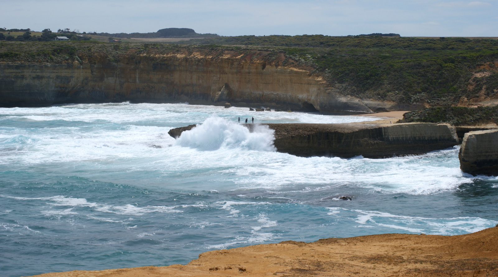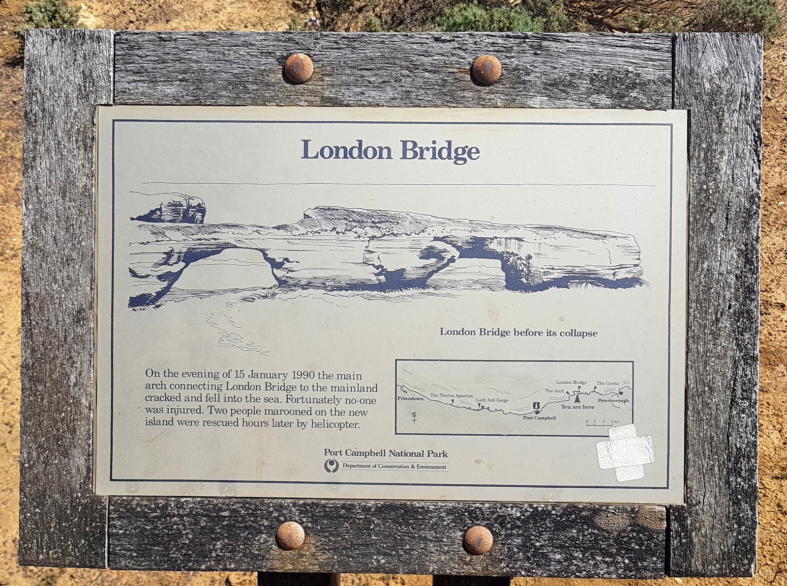 1 kms après, on arrive au London Bridge, le 2ème site le plus connu après les 12 Apôtres. Jusqu’en 1990, il était relié à la falaise par une double arche et il avait été surnommé London Bridge à cause de sa similarité avec le célèbre pont londonien. Et patatras, la première arche, la plus mince et la plus fragile, s’est effondrée alors que 2 touristes se trouvaient à l’extrémité! Heureusement, ils ont été héliportés et il n’y a eu aucun blessé!