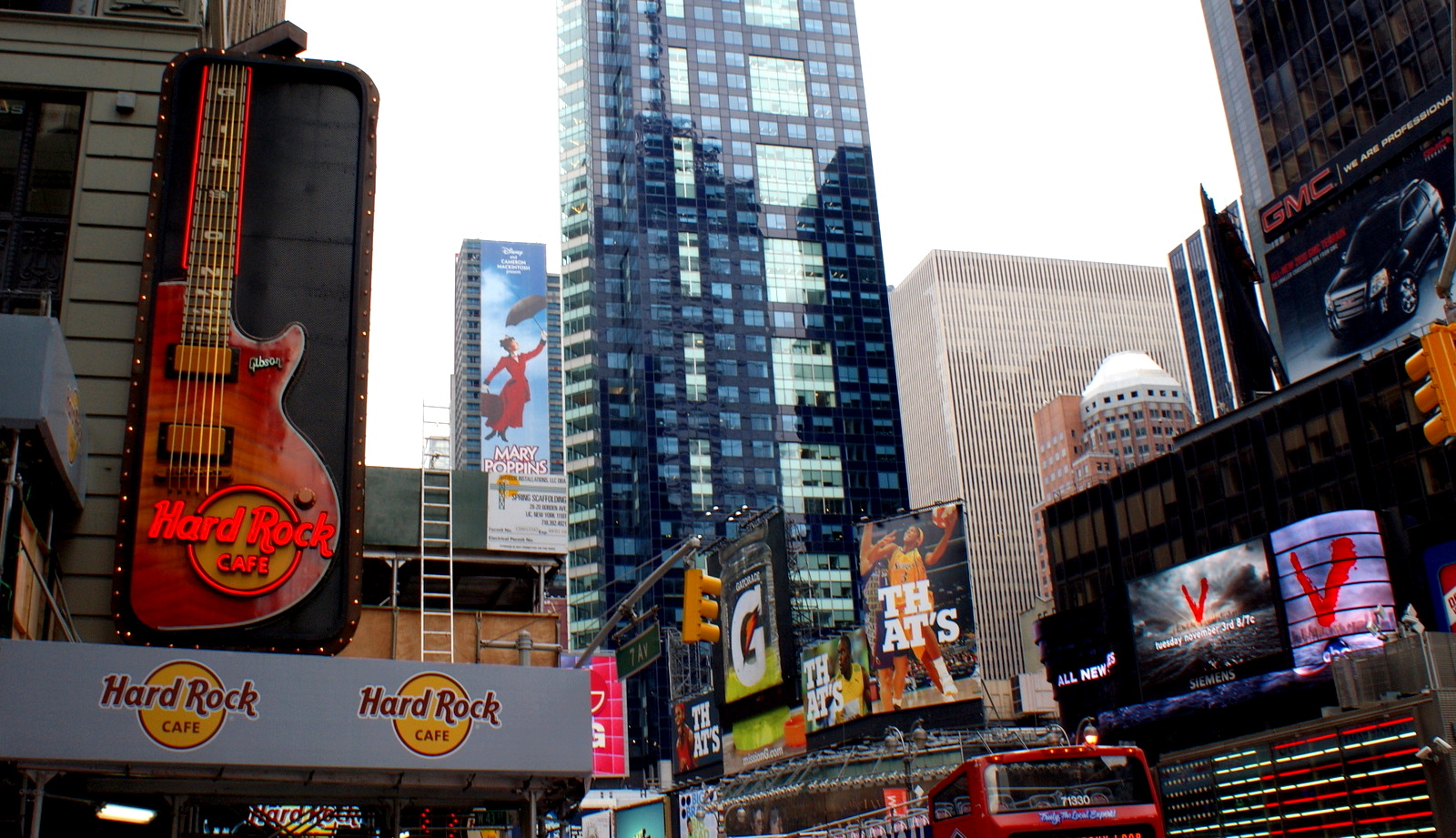 Pas trop faim entre le décalage horaire et tout ce qu’on a mangé dans l’avion mais on va quand même manger une salade au HARD ROCK CAFE juste à côté sur Broadway, histoire de ne pas se réveiller en pleine nuit à cause de la fringale !!! Le mur de guitares est vraiment impressionnant!!!