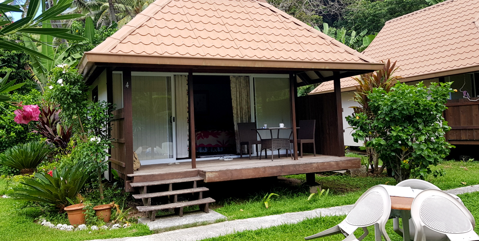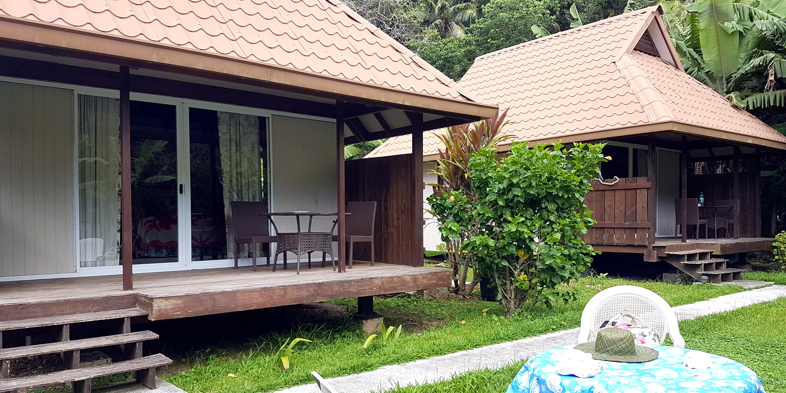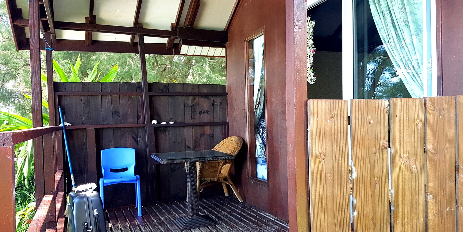 A notre retour de notre séjour en Robinson sur le motu Rani (voir l’article), on déménage dans le bungalow jardin le plus proche de la maison et on ne le regrettera pas. Il est beaucoup plus grand, mieux aménagé, tout fonctionne… bref, il est de construction professionnelle !!! Il est au même tarif que le bungalow plage. Donc, c’est vraiment 2 ambiances très différentes que vous pourrez choisir: ou un bungalow petit et rustique en bord de plage ou un autre plus confortable au fond du jardin…