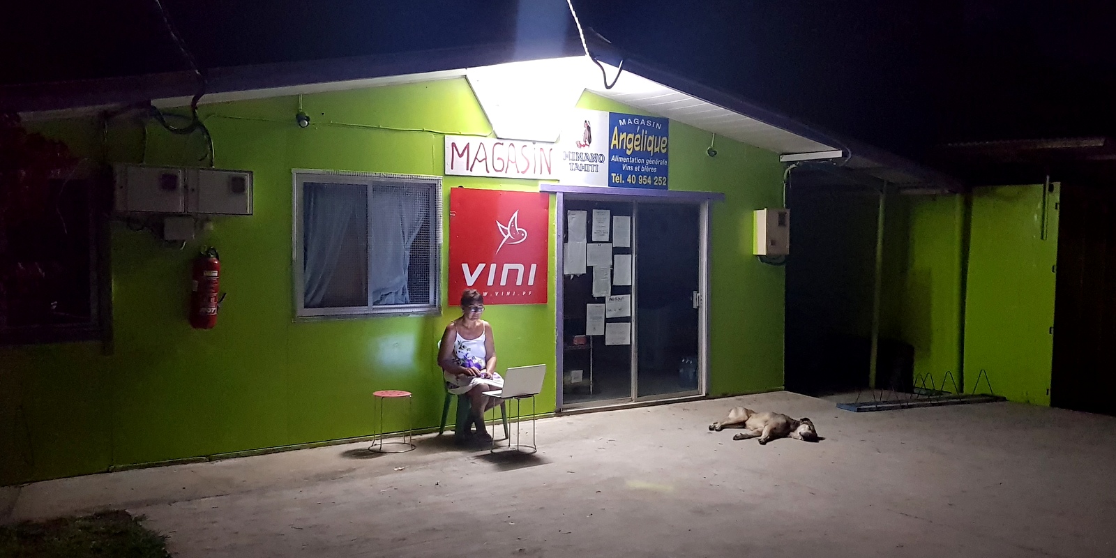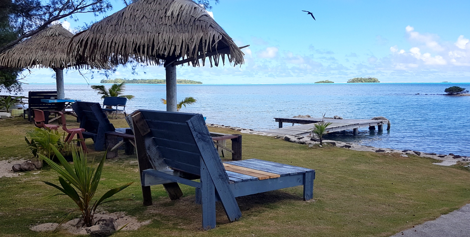 C’est encore lui qui nous a installés dans le bungalow n°1 et très vite, on s’est rendus compte qu’étant exposés plein nord, au nord de l’île, la vue sur le coucher de soleil allait être compromise !!! La vue sur le lagon n’est pas la meilleure non plus à cause de l’arbre immense juste devant la terrasse, la lampe du plafonnier est cassée, il n’y a qu’une seule prise électrique qui fonctionne, on a l’impression que le bungalow va exploser quand on tire la chasse d’eau, on prend une douche quand on ouvre le robinet du lavabo…(construction artisanale comme nous informe Dennys), on ne peut plus payer en carte de crédit et la connexion internet est plus que fantaisiste (il faut payer 300 CFP à l’épicerie, tenue par la fille d’Eléonore et Dennys, pour avoir le code de connexion et ensuite s’installer devant l’épicerie en bord de route pour espérer pouvoir se connecter !!!…) mais on est en vacances et juste au-dessus d’une jolie plage qui invite à la baignade… alors, on ne tiendra pas compte de ces petits désagréments!