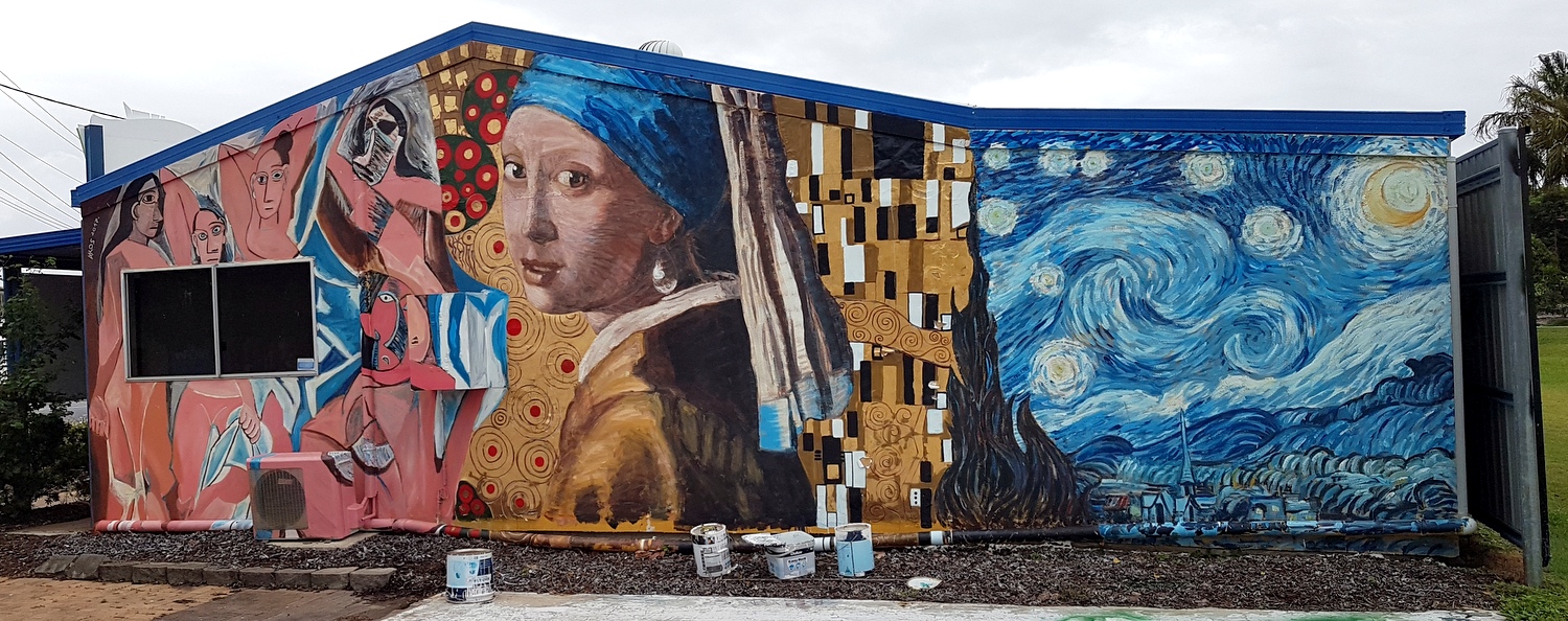 Ce mural est très original puisqu’il a été inspiré par 4 célèbres artistes: Picasso (les demoiselles d’Avignon), Johannes Vermeer (la jeune fille à la perle), Van Gogh (la nuit étoilée) et Klimt… Une œuvre magnifique réalisée en 3 semaines par l’artiste et dont vous pouvez voir la vidéo You Tube ci-dessous…