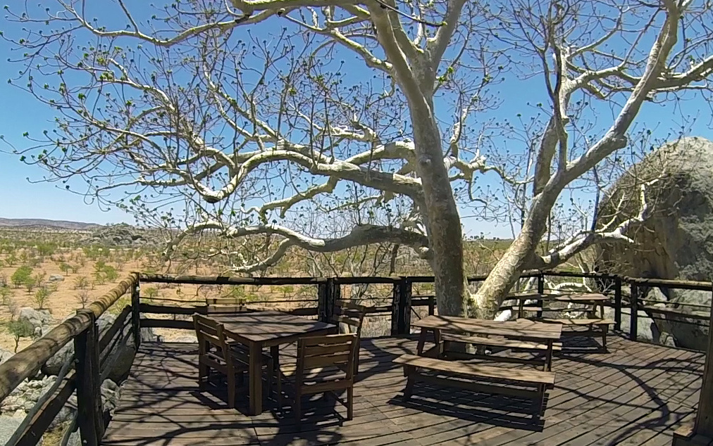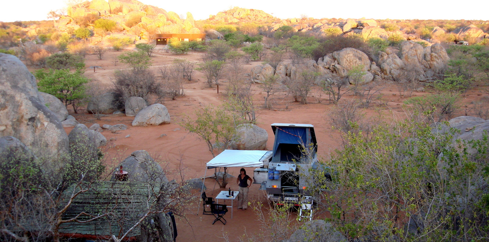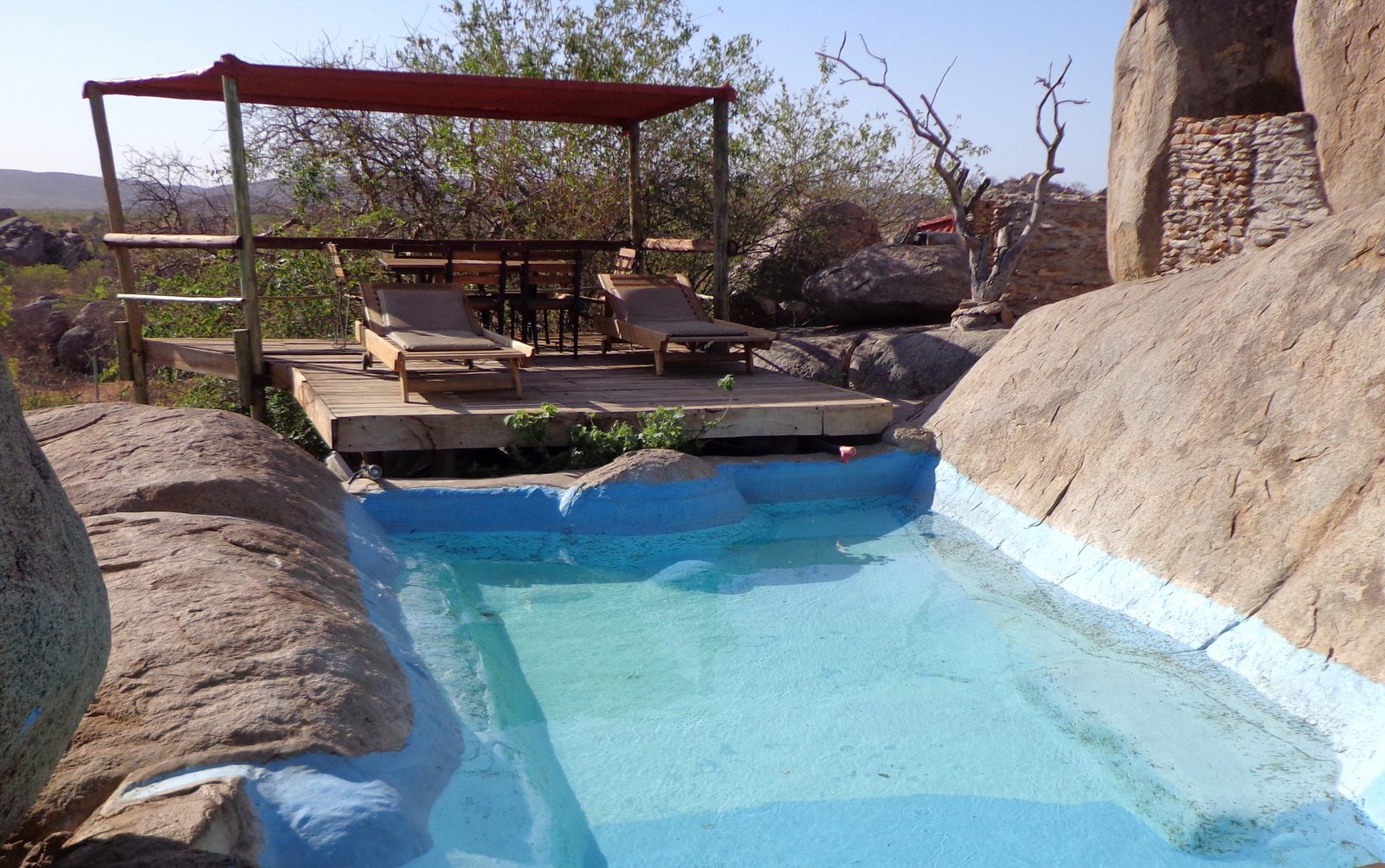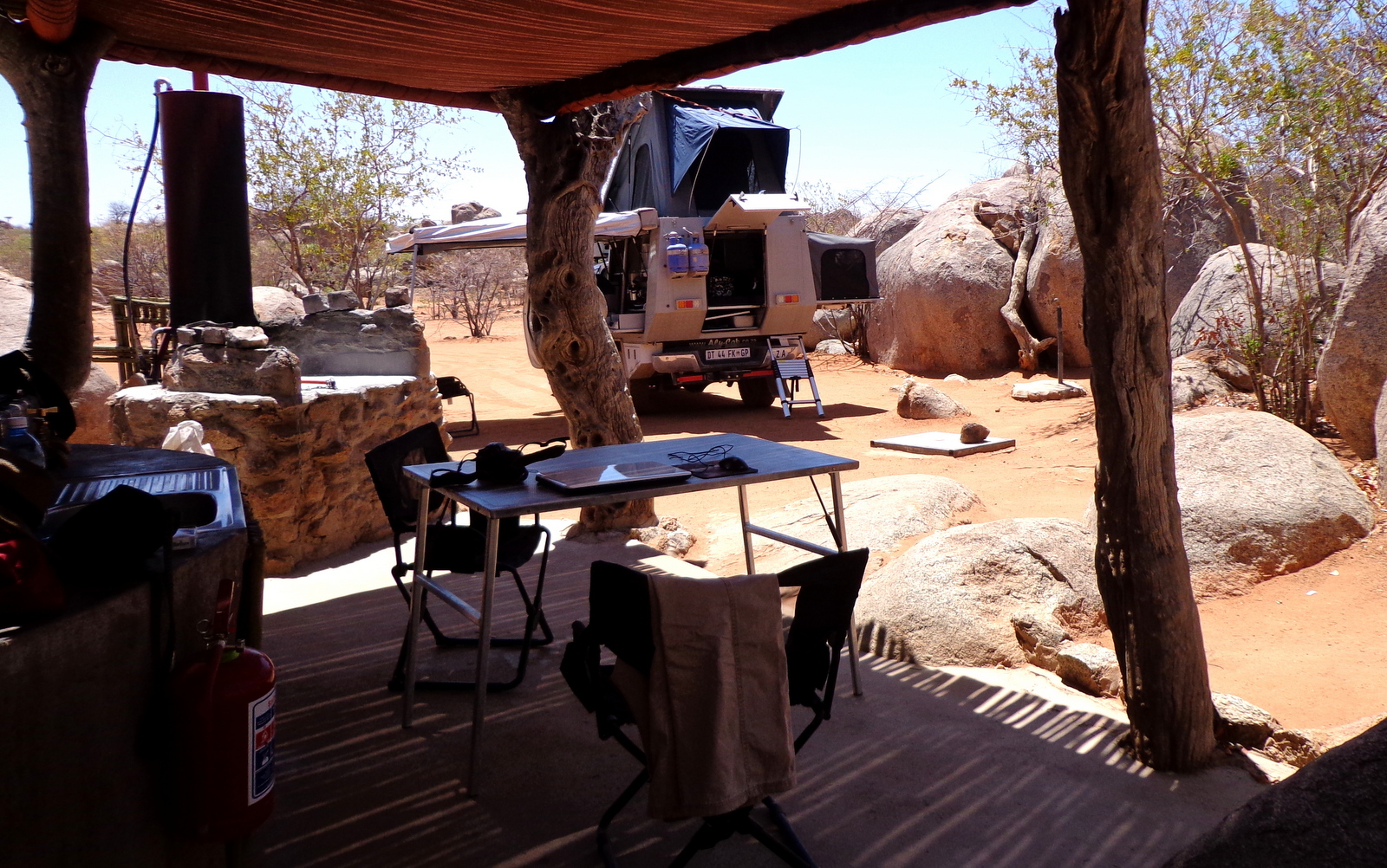 Les emplacements sont incroyables, tout est creusé dans la roche ou organisé autour des rochers avec beaucoup de goût… Même la piscine !La douche en plein air est digne d’un magazine de déco même si elle n’est pas très pratique. C’est ici que l’on expérimentera pour la première fois le « Donkey »: c’est un réservoir à eau placé au-dessus d’un feu de bois qui ressemble à un gros poêle à bois et qui distribue l’ eau chauffée dans la douche et l’évier pour la vaisselle. Système très efficace encore inconnu pour nous mais très courant en Namibie…