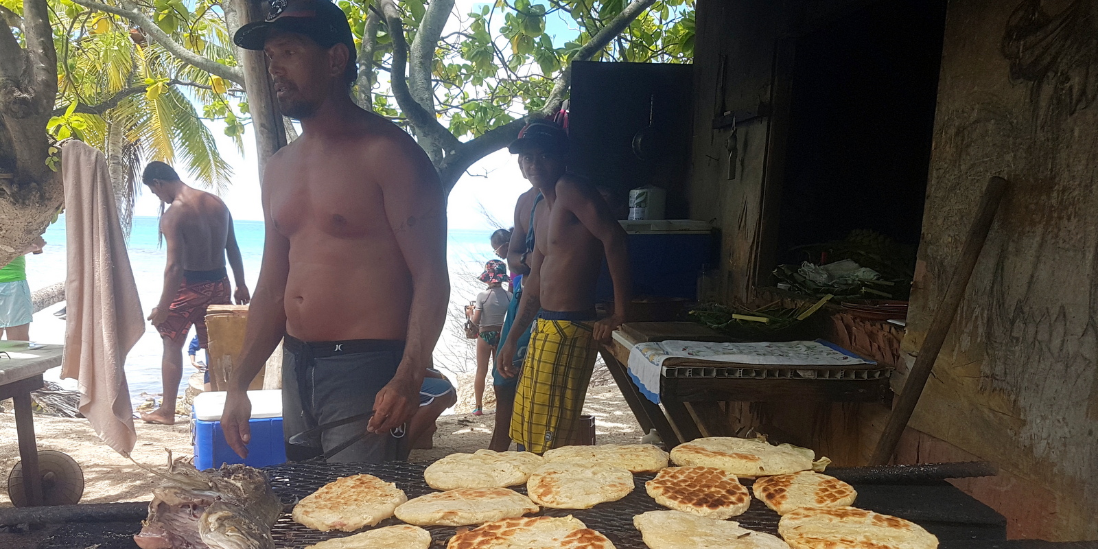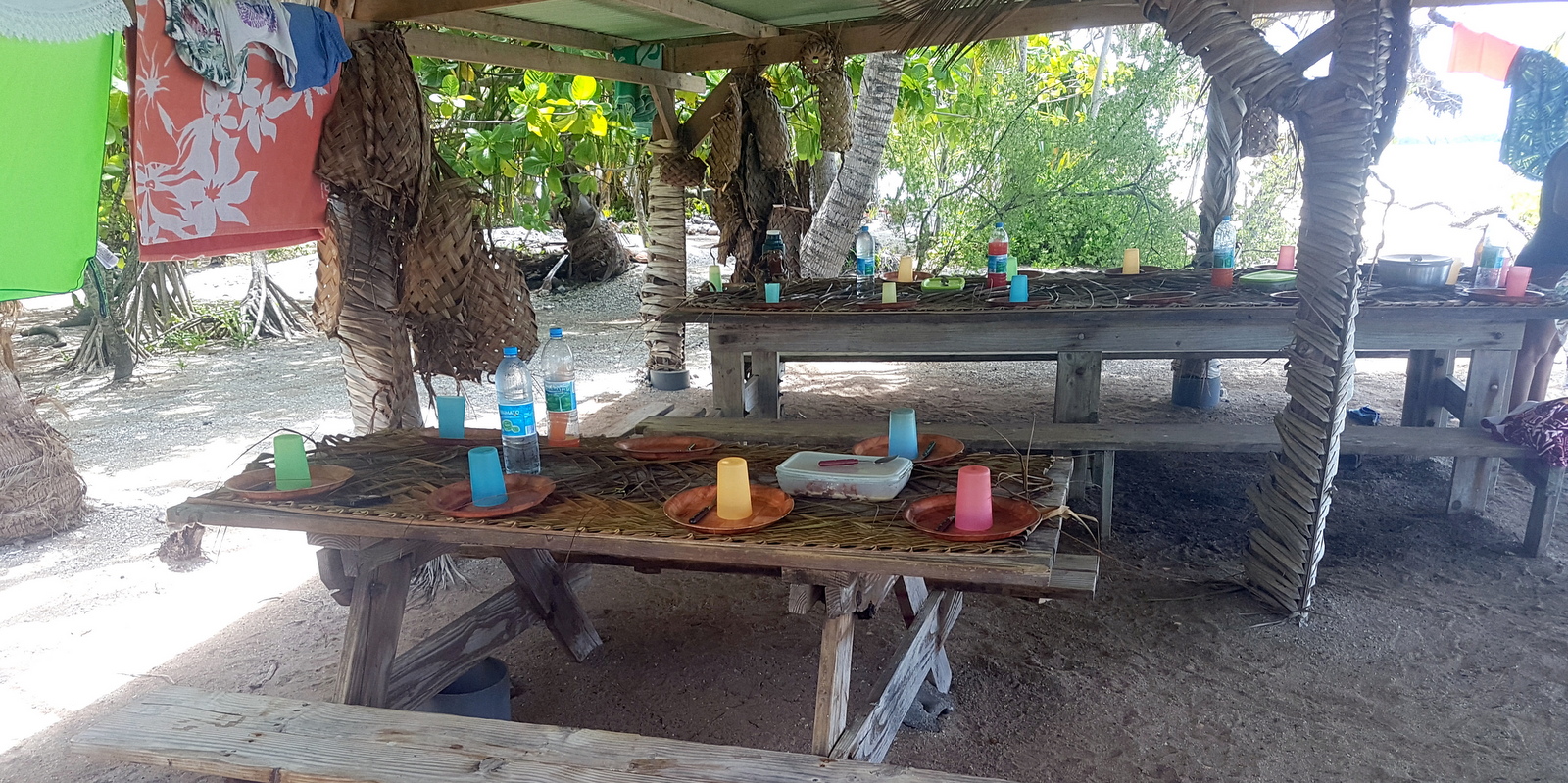 J’avoue qu’il est difficile de quitter cet endroit féérique même pour le pique-nique sur un motu voisin. Assis autour d’une grande table en bois sous une paillote en bord de plage, le repas est copieux et diversifié. Le pain coco de la femme de Léon est juste divin !!! Inutile de demander la recette, il ne vous la donnera pas, secret de famille !!!
