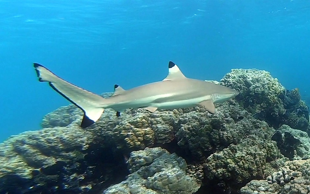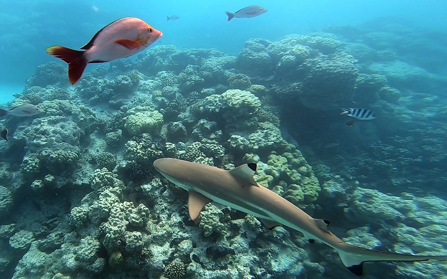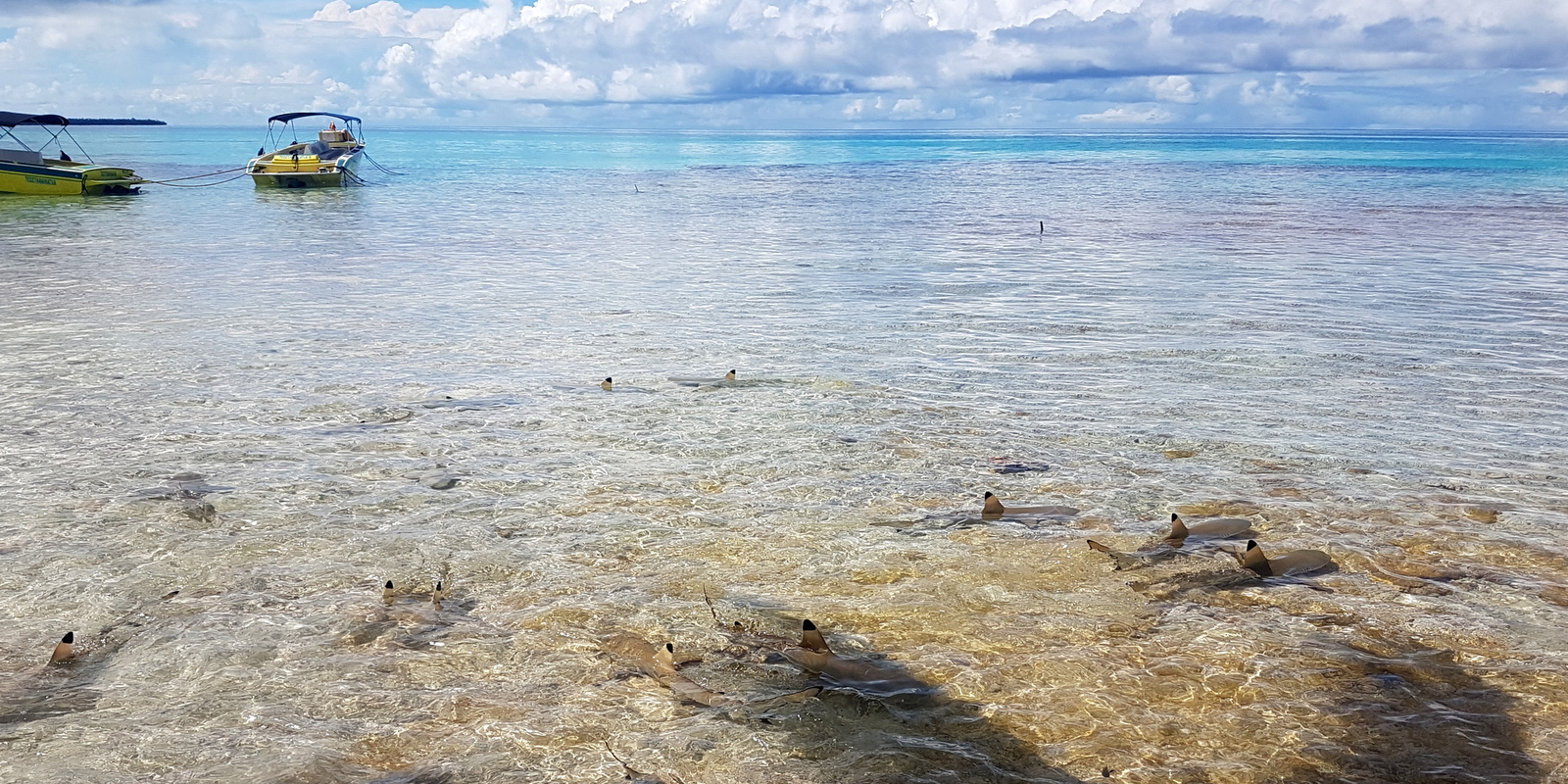 On passe ensuite 1 h ou 2 à se baigner dans le lagon au beau milieu d’une nurserie de bébés requins Pointe-Noire totalement inoffensifs et même plutôt familiers et on reprend le bateau pour s’arrêter à l’Aquarium.