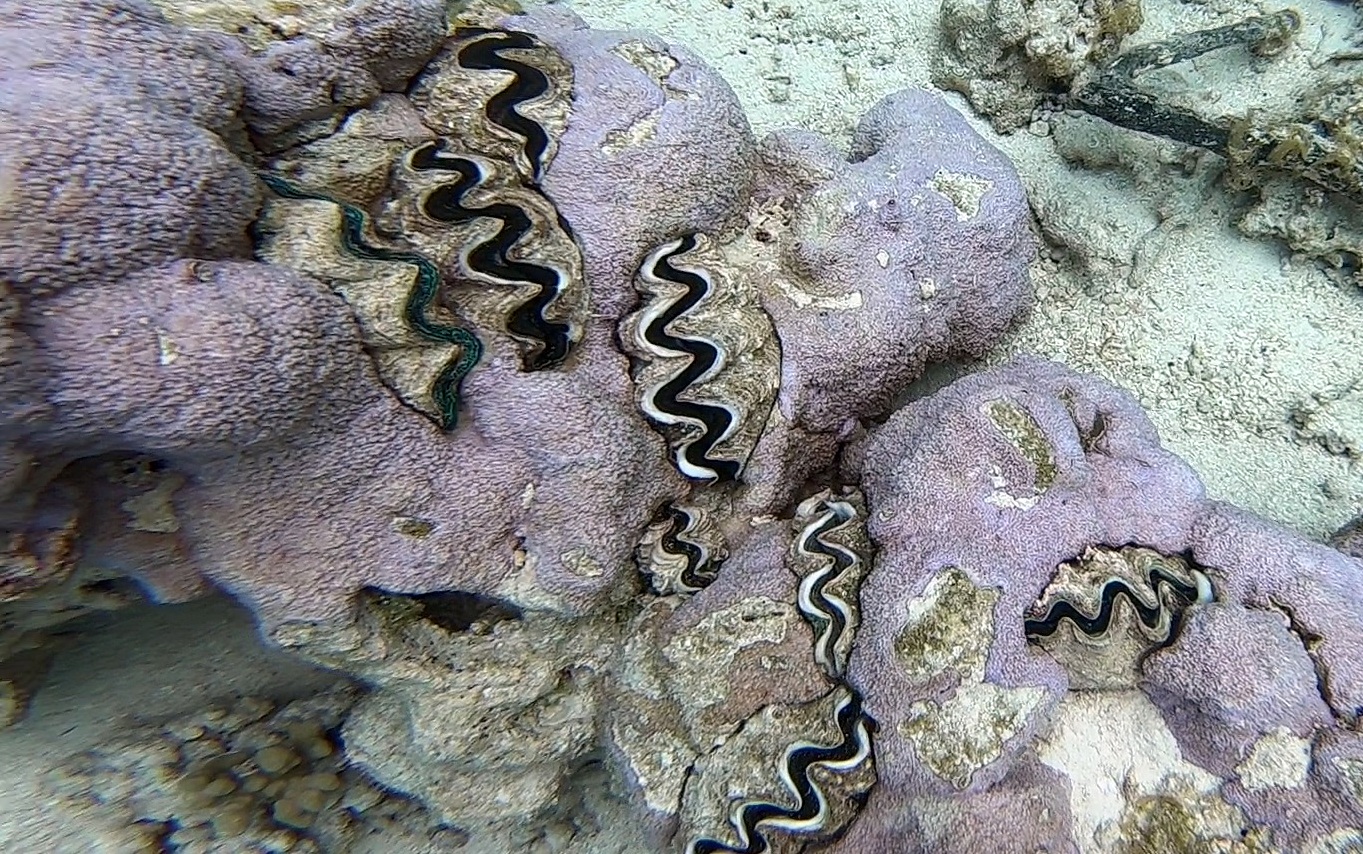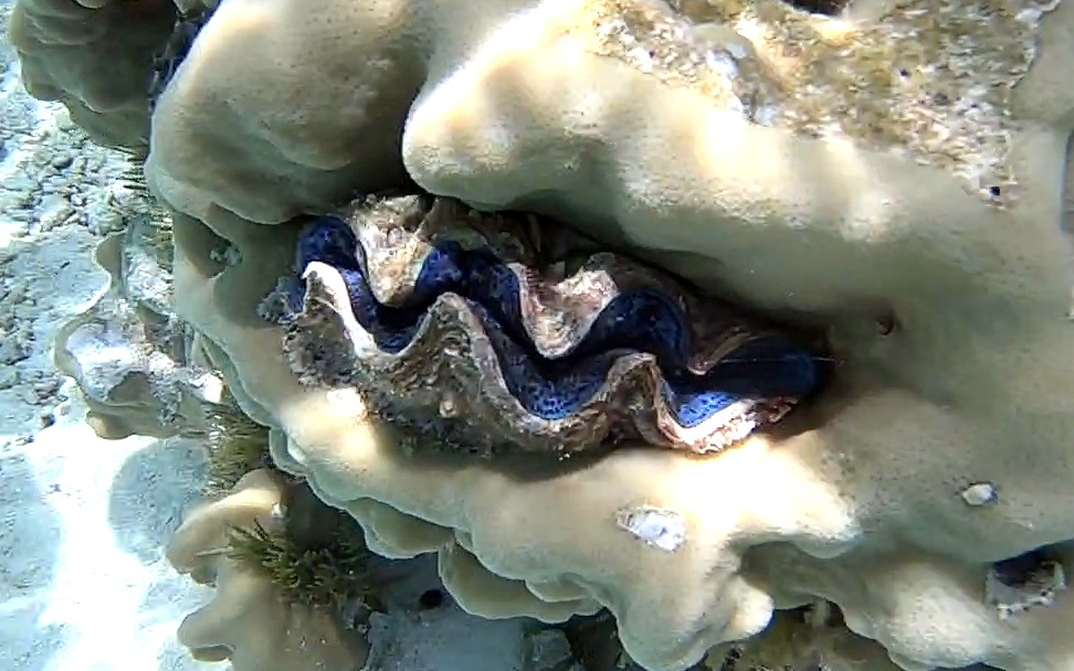 A marée basse, il n’y a pas assez d’eau pour qu’il y ait une rivière, ne restent donc qu’une multitude de petits bassins peu profonds dans lesquels, on peut rencontrer une faune étrange comme ce Cordon Mauresque (la plus grande des limaces de mer) que nous n’avions jamais vu auparavant et dont nous avons fait cette vidéo ci-dessous, du corail violet très en forme et une multitude de bénitiers de différentes couleurs…