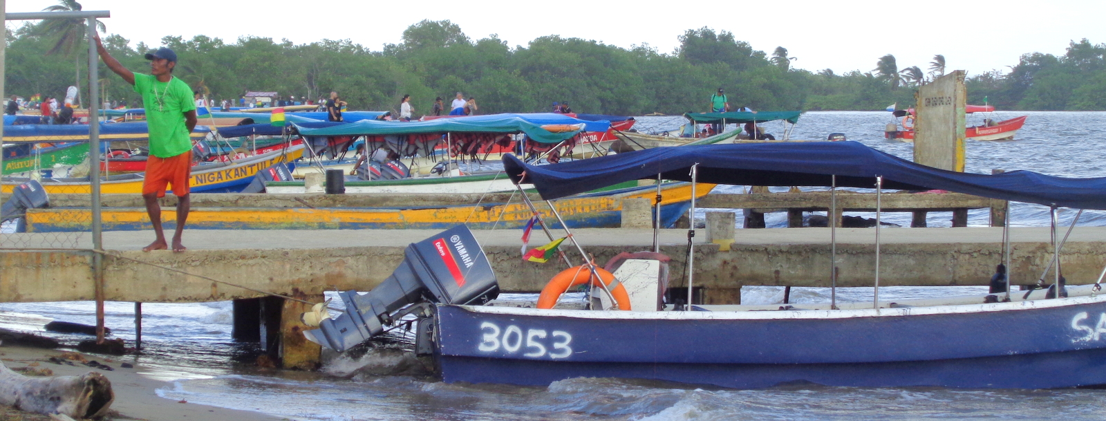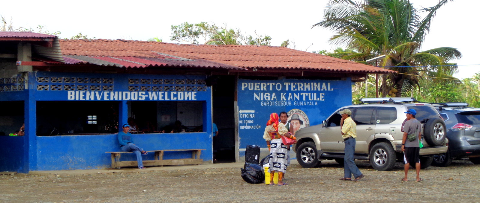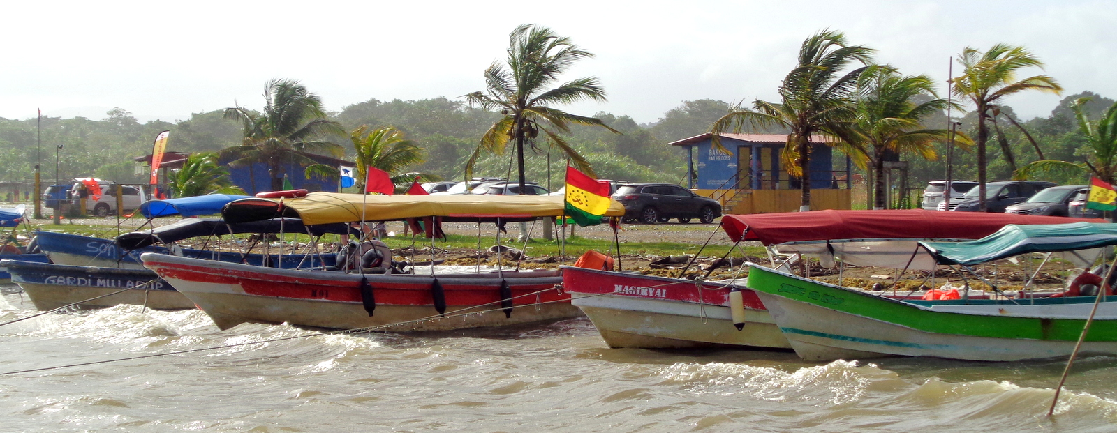 Nous attendons que quelqu’un nous dise où aller ensuite. Très vite, une petite femme Kuna très sympathique et énergique qui donne l’air de tout gérer nous demande de payer la taxe d’1$/ personne pour avoir le droit d’utiliser le quai et d’attendre notre bateau pour embarquer…