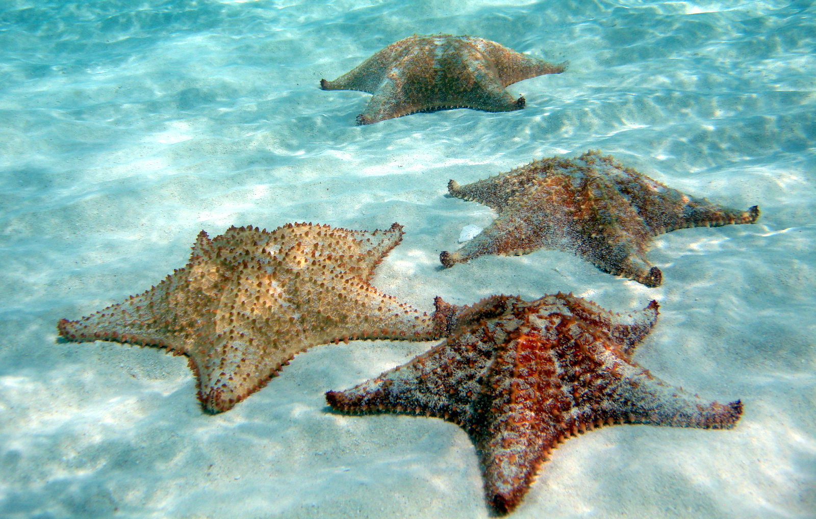 Après quelques baignades et un déjeuner de poisson et de fruits préparé par des femmes kunas en tenue traditionnelle, nous reprenons le bateau pour aller voir des étoiles de mer énormes qui jonchent le fond d’un trou bleu en pleine mer…