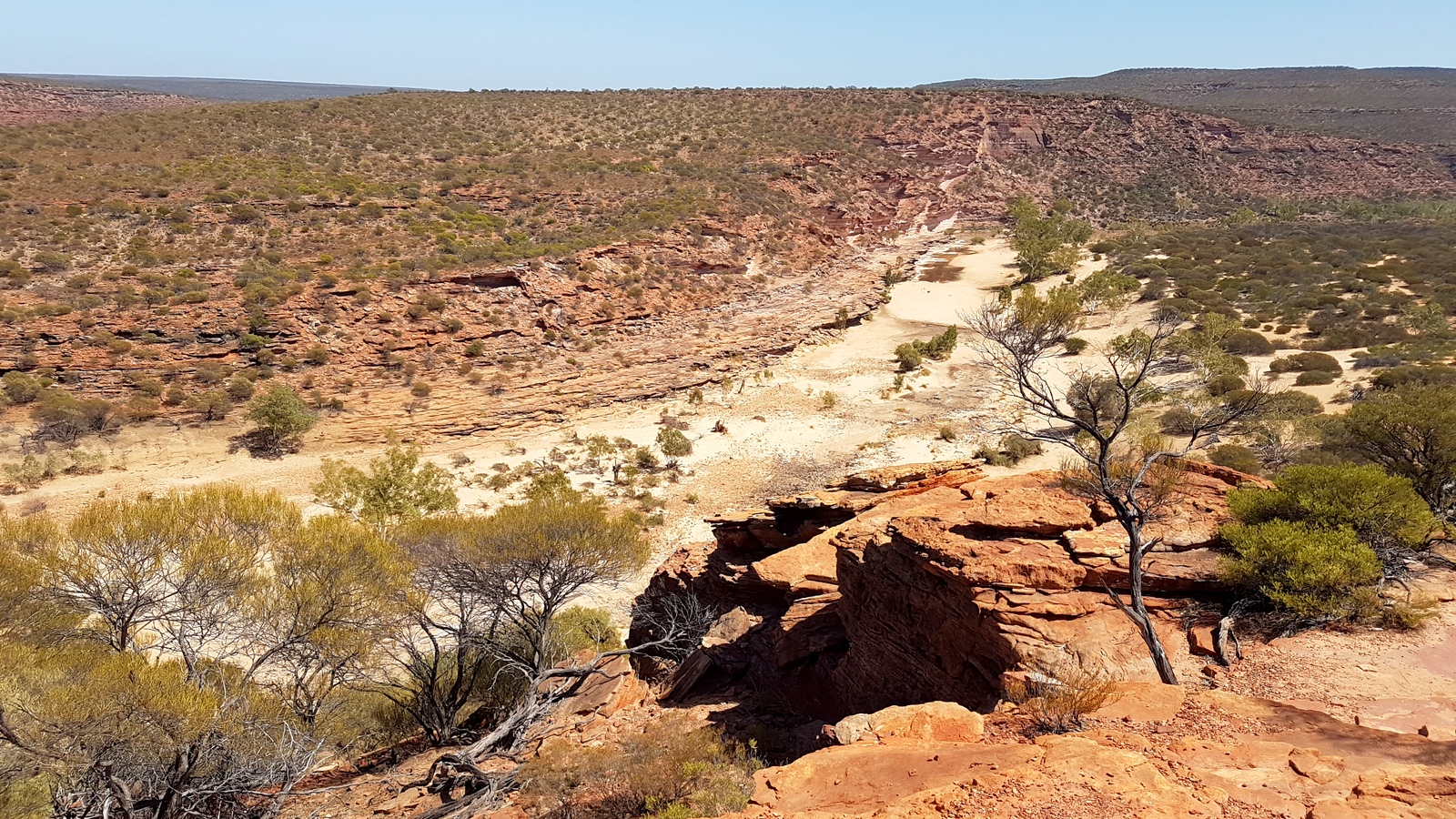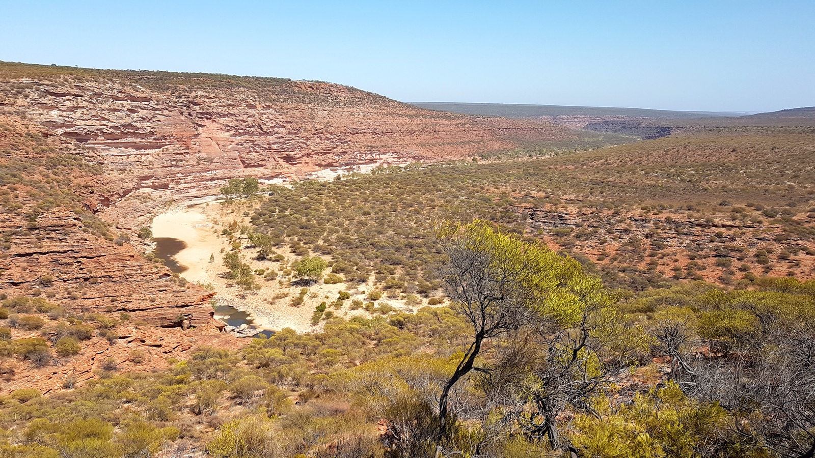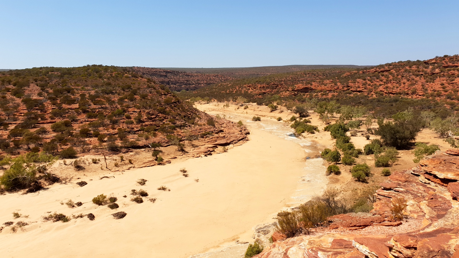 Un peu plus au sud, ce point de vue doit son nom à la courbe en Z que fait la rivière à cet endroit. Pas besoin de retourner au parking, un sentier y mène directement depuis la Nature’s Window. La végétation sur le chemin est étonnante, on croirait qu’elle a été peinte avec de l’or et de l’argent… On y croise aussi de magnifiques banksias.