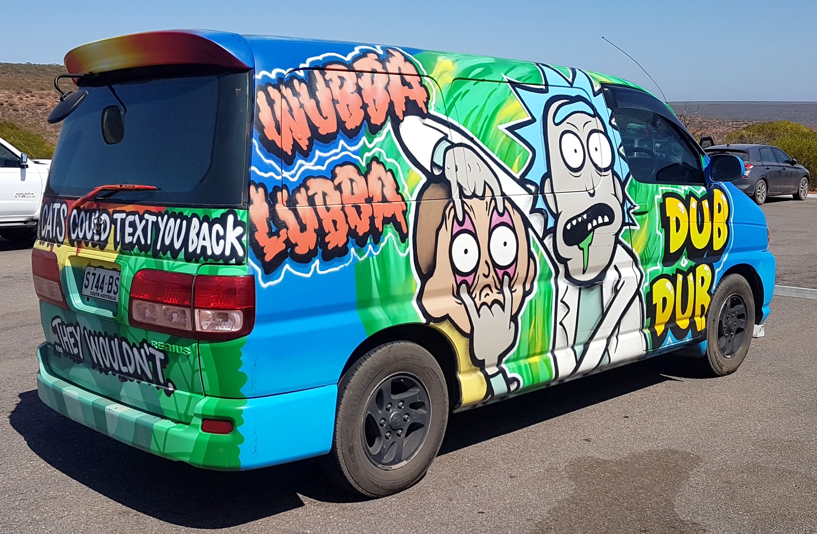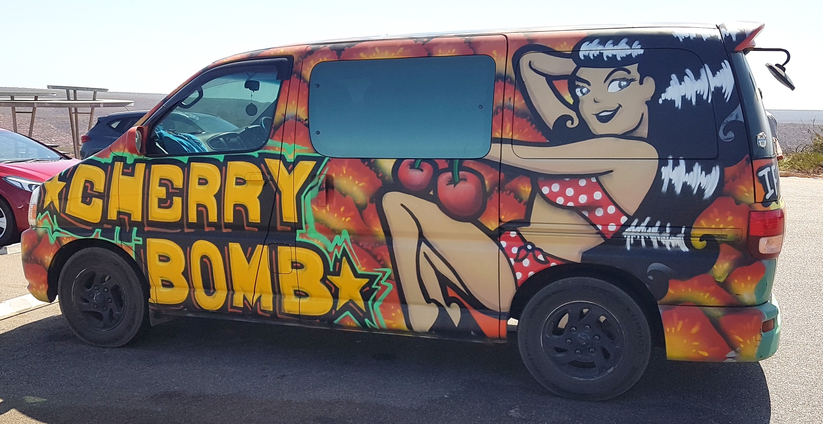 On retourne au parking pour trouver un de ces vans improbables de WICKED CAMPERS garé à côté de nous. S’ils sont réputés pour être les vans de location les moins chers, ils sont tous décorés de dessins et de slogans hippies mais aussi souvent sexistes, vulgaires ou offensants… Ils créent beaucoup de controverses auprès des australiens et de nombreuses pétitions ont essayé de les retirer de la circulation. Je n’aurais jamais accepté de rouler avec car ils sont mal acceptés un peu partout et au niveau discrétion, on peut repasser mais je les trouve plutôt marrants!