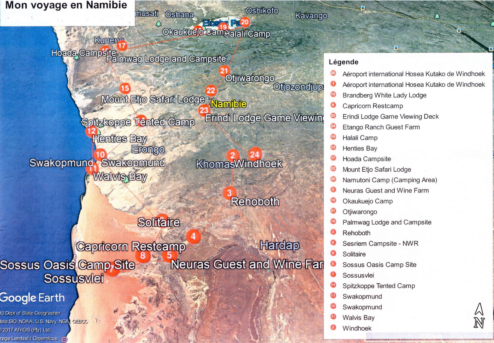 Pour les autres nuits, nous relevons des adresses qui ont l’air sympa mais nous nous gardons la liberté de changer en cours de route. Le site namibien, THE CARD BOX nous sera d’ailleurs d’une grande aide pour trouver des hébergements et réserver en ligne sur place.