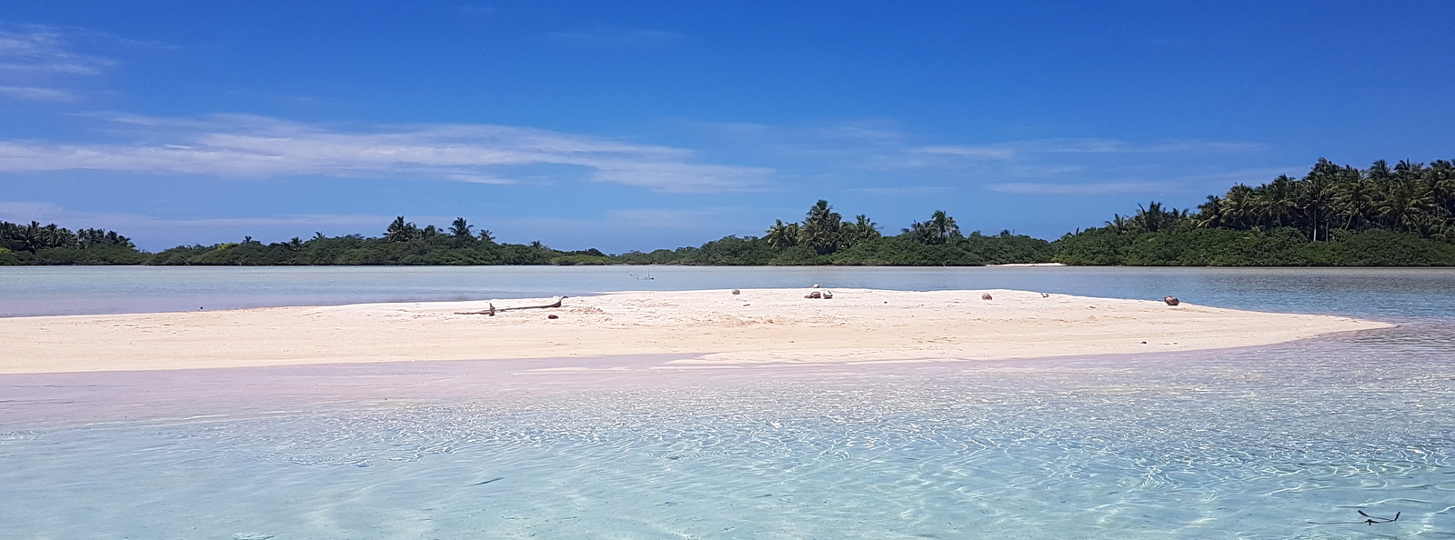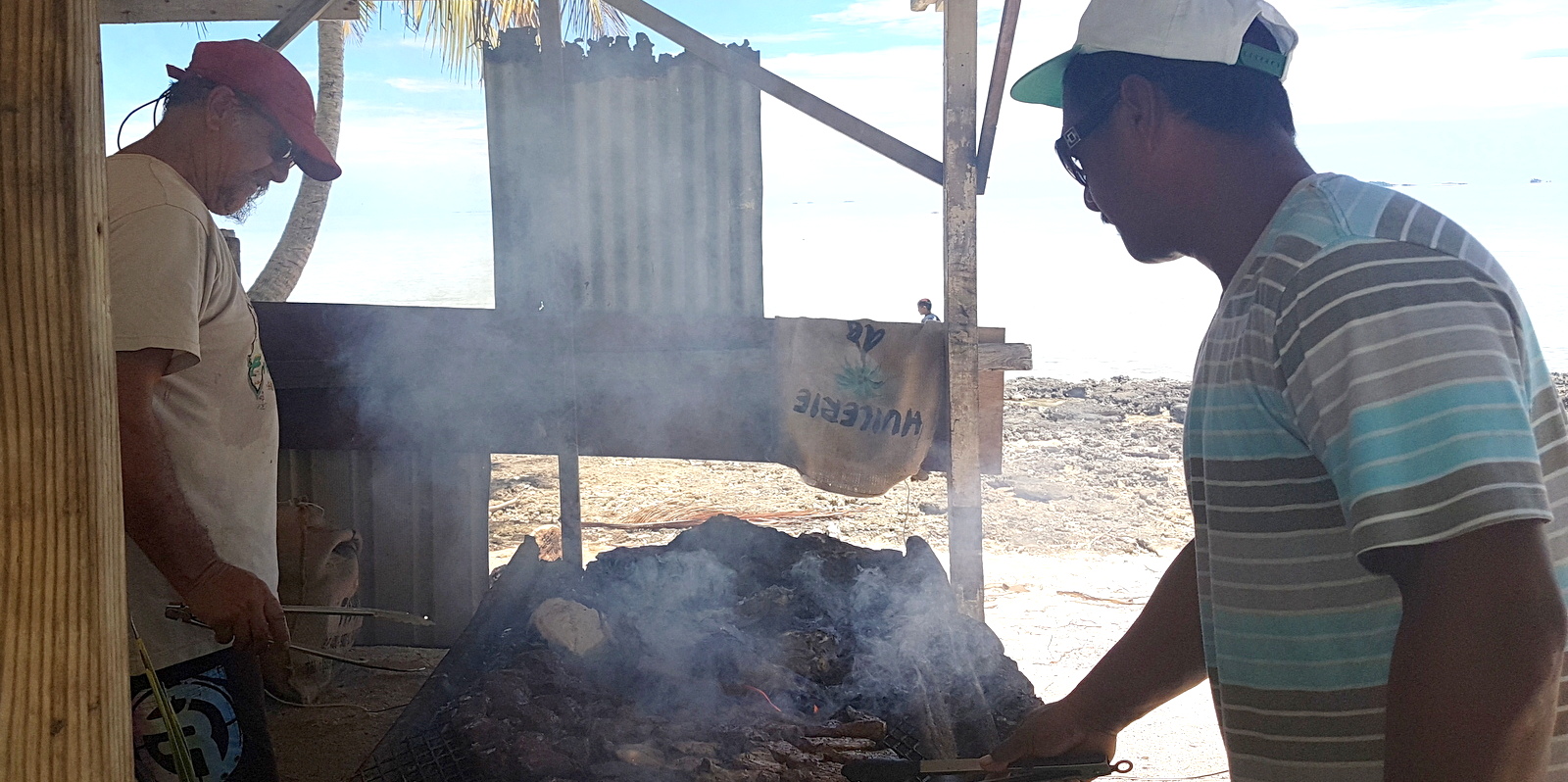 Pendant que nos accompagnateurs s’affairent de suite à la préparation du déjeuner et de la cuisson des poissons fraîchement pêchés, on nous propose de traverser le lagon à pied pour rejoindre le motu en face: l’Ile aux Oiseaux…