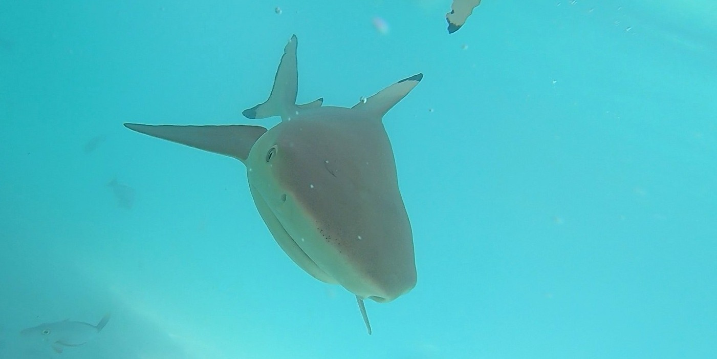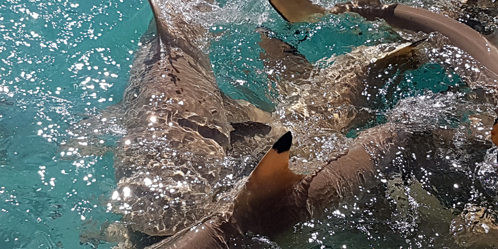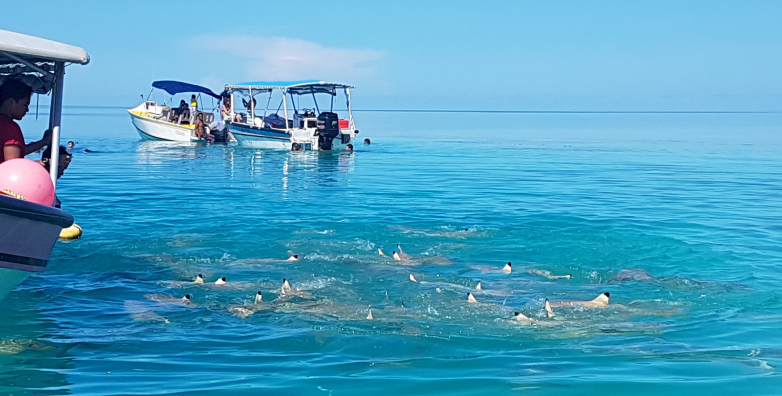 Avant de repartir, on jette les restes de notre repas aux nombreux requins et c’est la folie… Ça grouille de partout et de toutes tailles !!! Devant tant de frénésie, je préfère rester sur le bateau même si on est invités à se mettre à l’eau… Mon compagnon, plus téméraire, y plonge avec la GoPro pour les voir de plus près !!!…