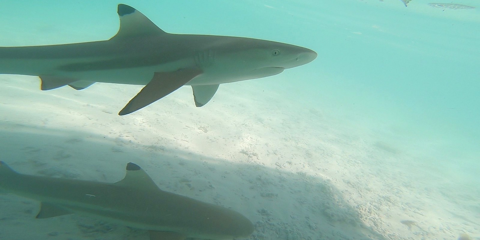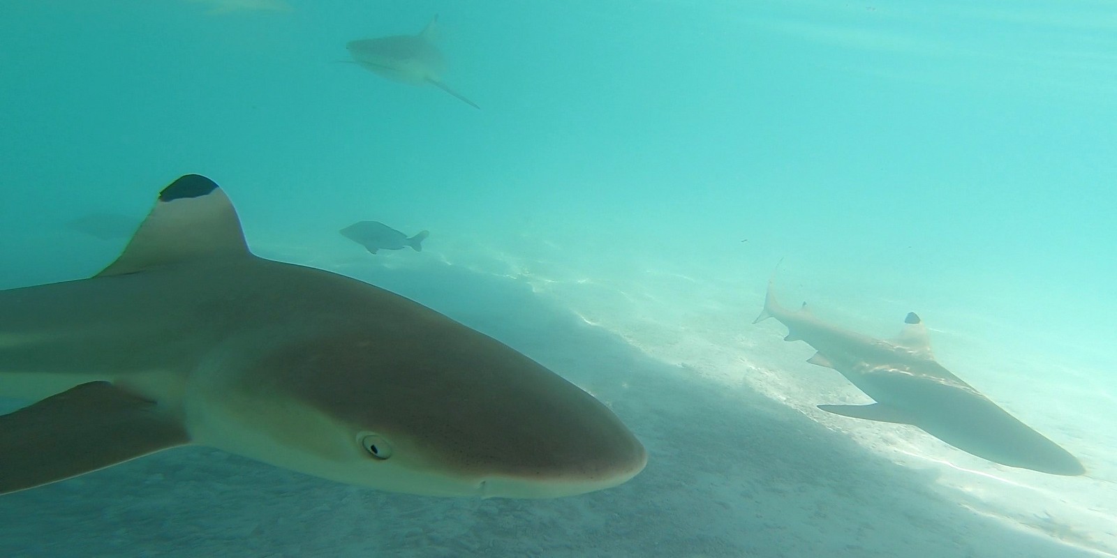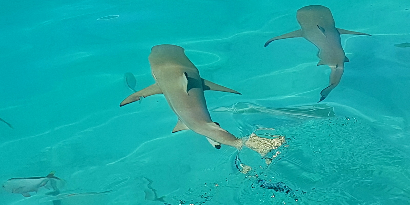 Avant de repartir, on jette les restes de notre repas aux nombreux requins et c’est la folie… Ça grouille de partout et de toutes tailles !!! Devant tant de frénésie, je préfère rester sur le bateau même si on est invités à se mettre à l’eau… Mon compagnon, plus téméraire, y plonge avec la GoPro pour les voir de plus près !!!…