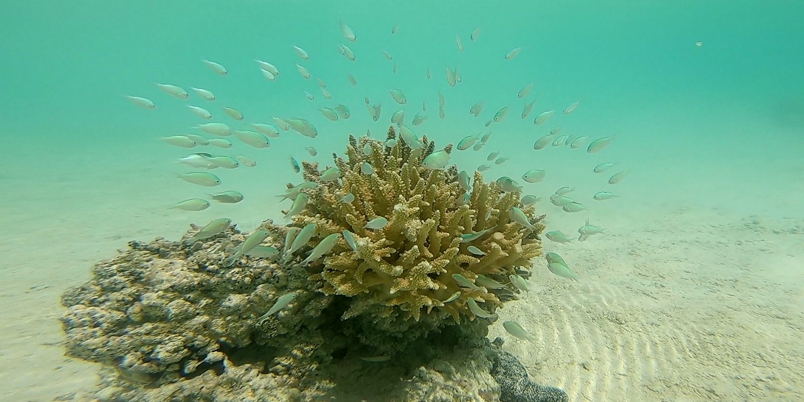 On fait ensuite un stop près d’un autre motu où l’eau est d’une limpidité incroyable. Plus de patates de corail, donc de nombreux poissons de toutes sortes… un autre « aquarium » !!!