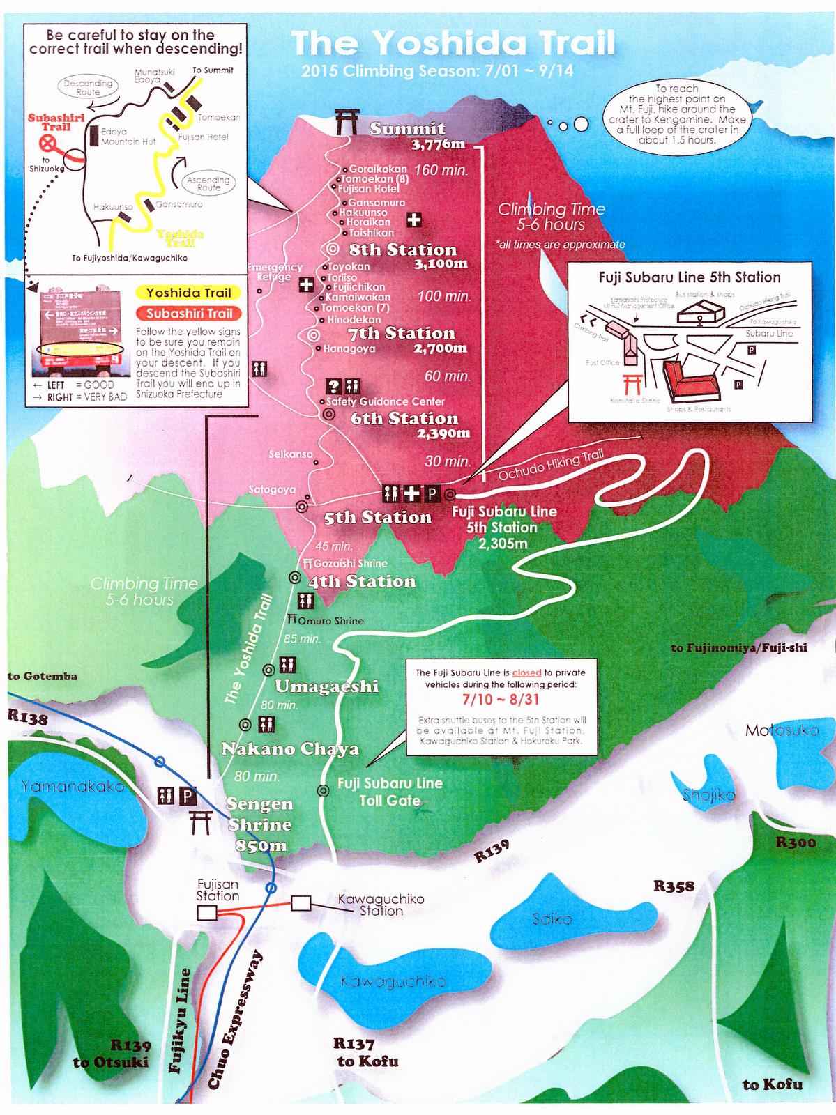 – Yoshida Trail (orange) dont le point de départ est la Fuji-Subaru Line 5th Station. C’est le plus fréquenté, celui où il y a le plus de huttes de ravitaillement, de toilettes…
