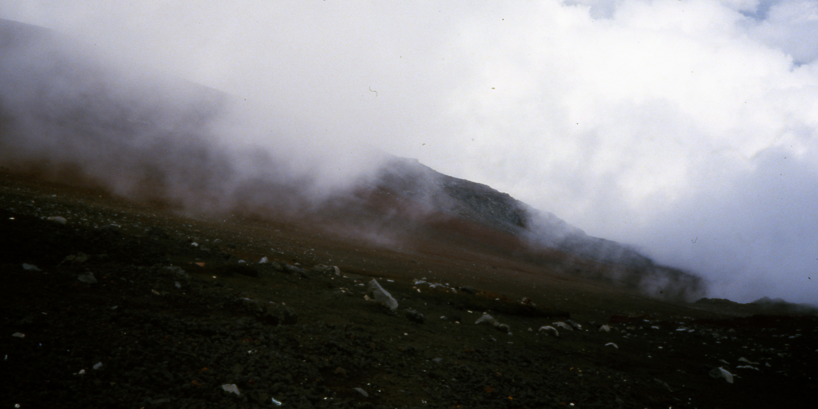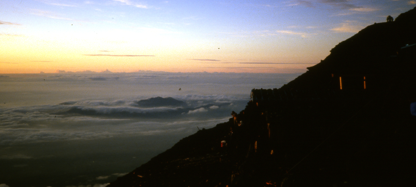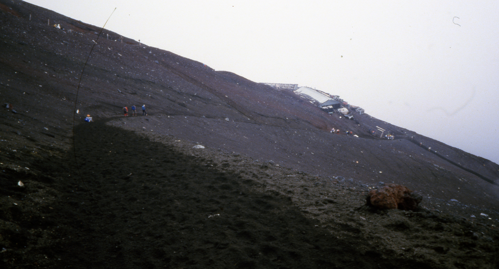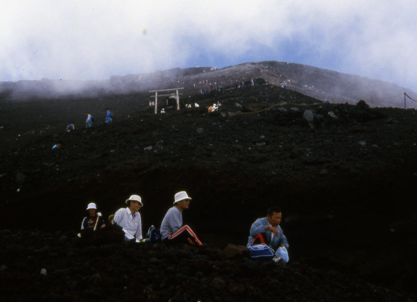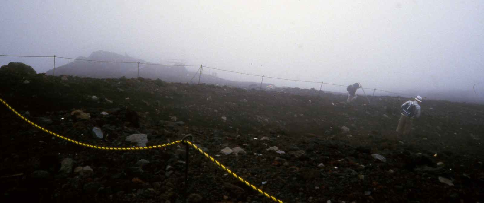 … et si la vision du soleil sur les nuages est féerique, le Fuji en plein jour l’est beaucoup moins: aucune végétation, de la lave sombre, des cailloux, du vent, du brouillard…