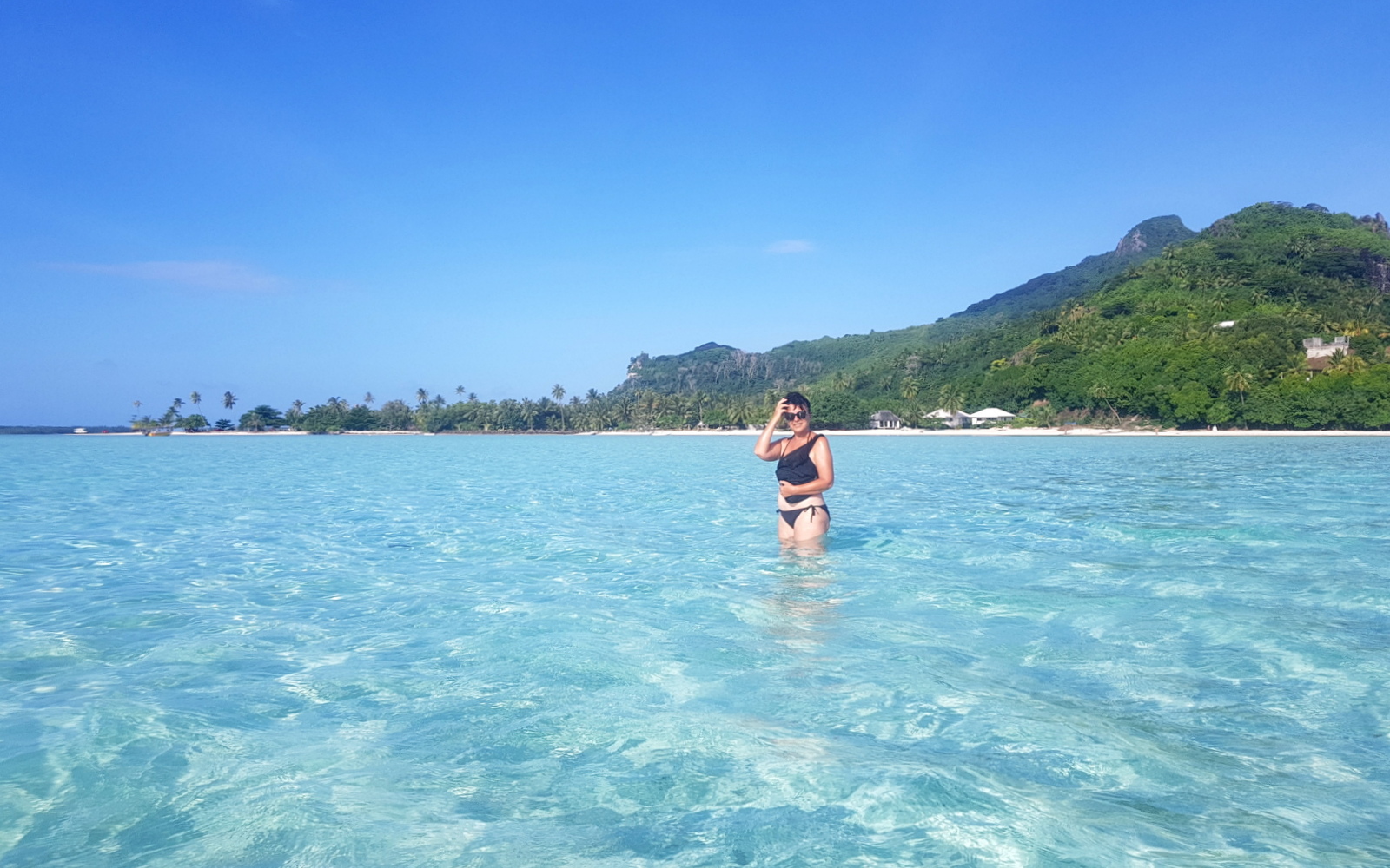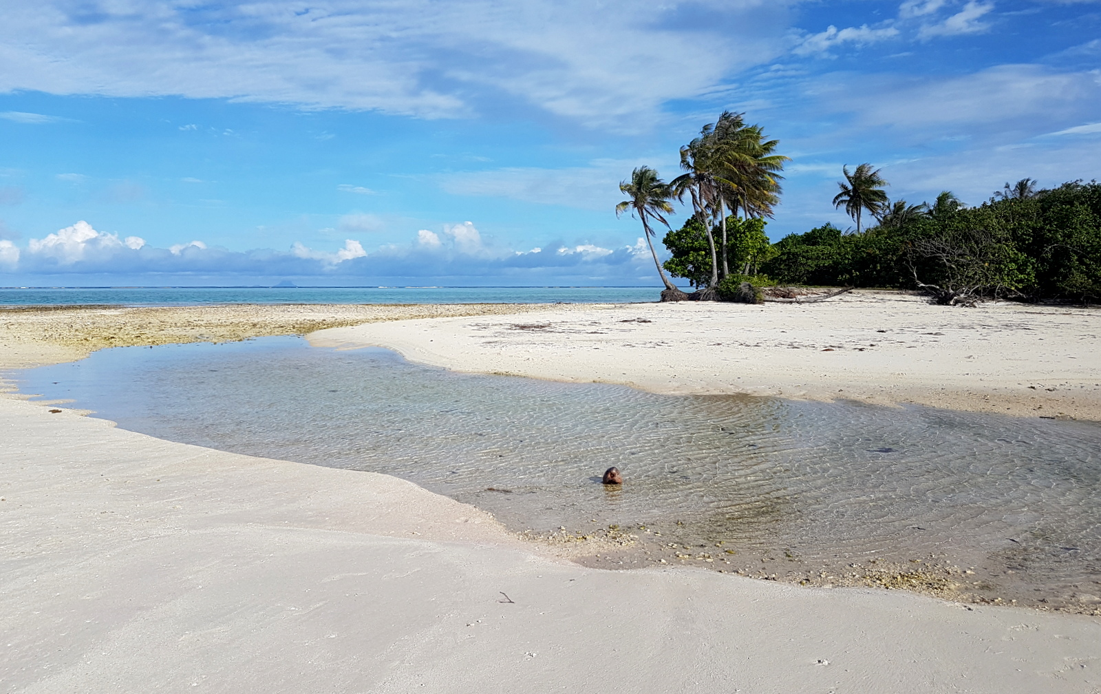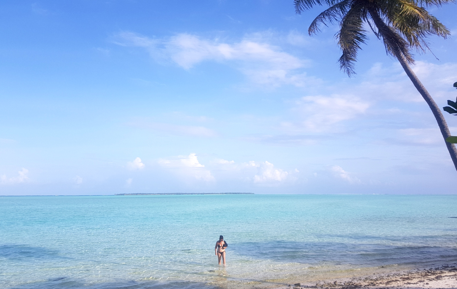 Elle se fait à partir de la plage Tereia pour rejoindre le motu Auira en face. C’est très facile et si on reste bien dans la partie verte la plus claire du lagon, on a de l’eau jusqu’aux cuisses au maximum. Il est recommandé de se méfier des raies pastenague et léopard couchées sur le sable et ne pas marcher dessus, en fait elles se sauvent vite à notre passage. Le motu est très grand et peu habité, il y est donc facile de se perdre, bien prendre ses repères… C’est sur ce motu que sont cultivées toutes les pastèques qu’on peut déguster sur Maupiti…