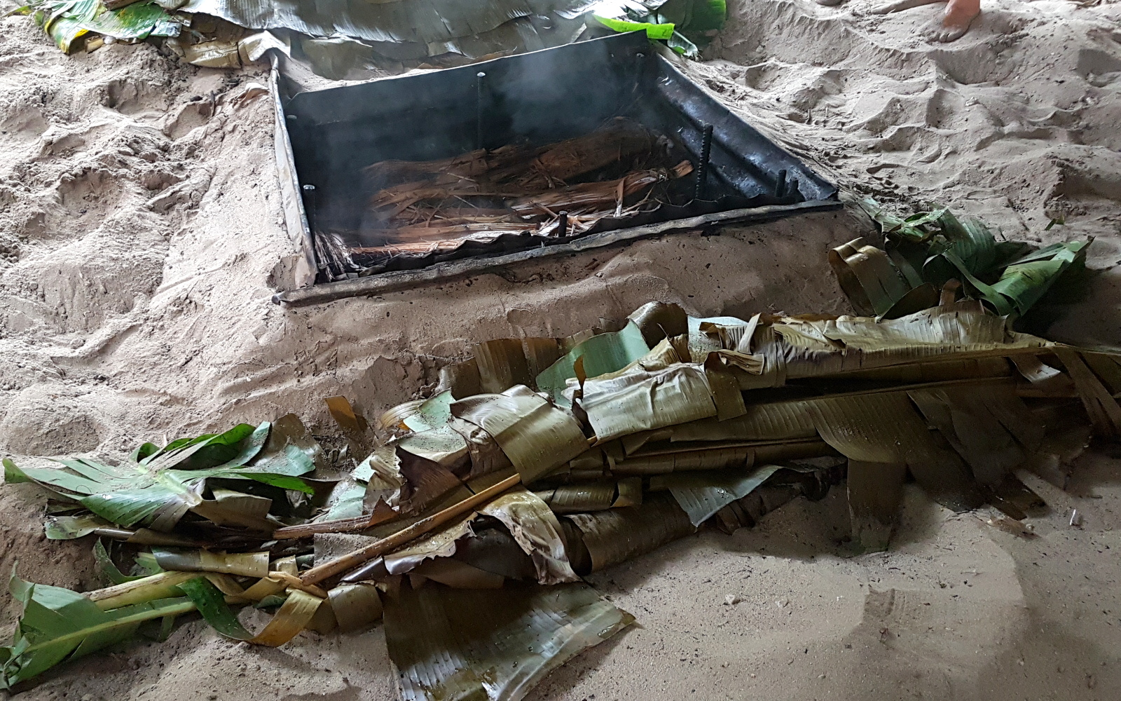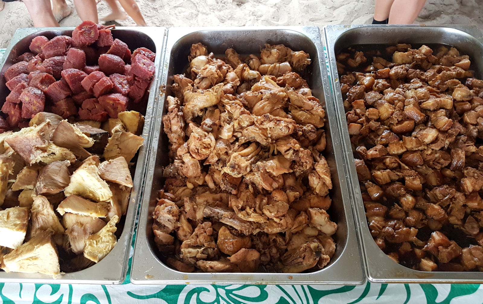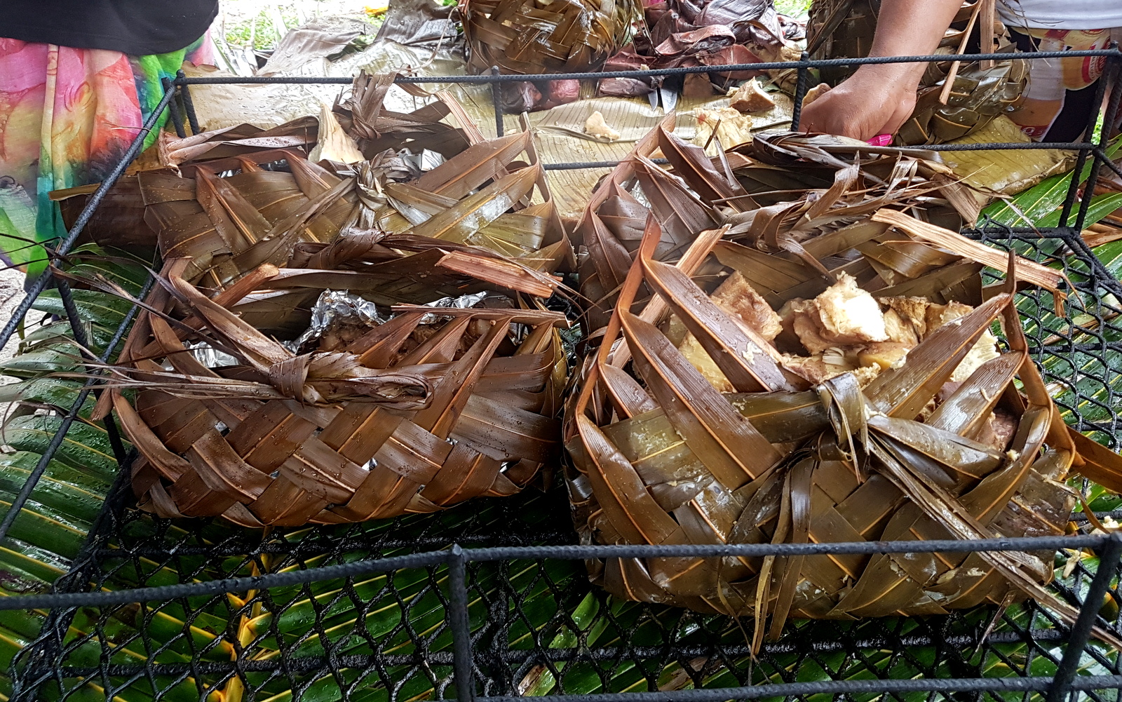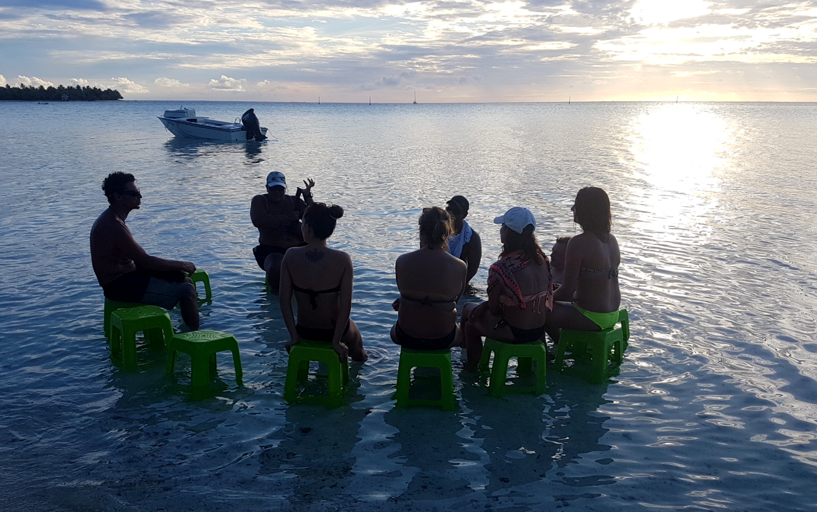 Tous les samedis, un four tahitien traditionnel est organisé sur le motu Tiapa’a à côté de la passe. Toutes les pensions s’y retrouvent pour partager un délicieux buffet de cuisine tahitienne dont le bénitier au lait de coco et fafa (sorte d’épinard)… Un vrai régal!!! Bon, j’avoue que je n’ai pas eu envie de goûter au Fafaru, ce qui a bien failli vexer nos hôtes mais même s’il parait que c’est délicieux, l’odeur m’a un peu rebuté…