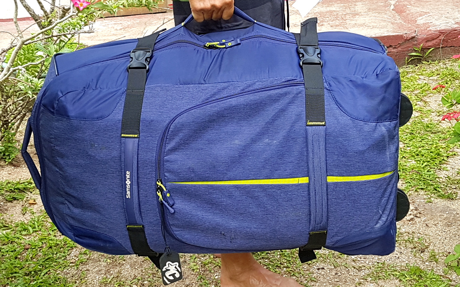Il est maintenant temps que je fasse un point sur le matériel que nous avons emporté sur ce voyage: une planche démontable en 2 parties (de la marque NOBILE), 2 voiles: une de 12m2 et une de 15m2, un gonfleur, les barres avec ligne, une combi shorty, une combinaison intégrale pour la plongée et tous les accessoires (sauf le harnais dans un autre sac) qui tenaient dans un sac de voyage à roulettes: le Rewind de Samsonite ( mais il en existe toute une liste qui conviennent également…).