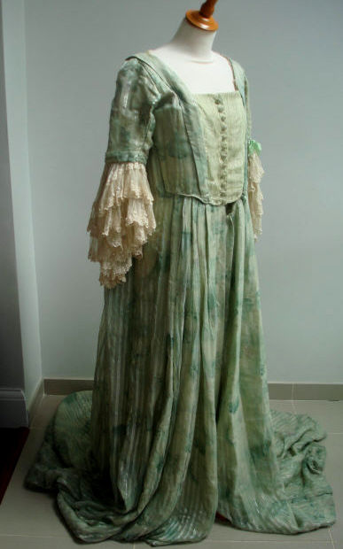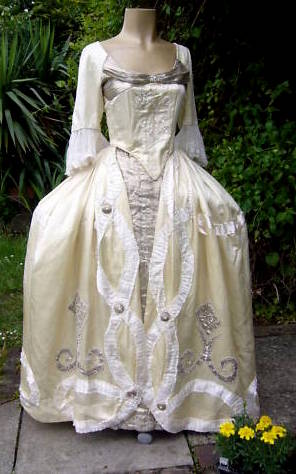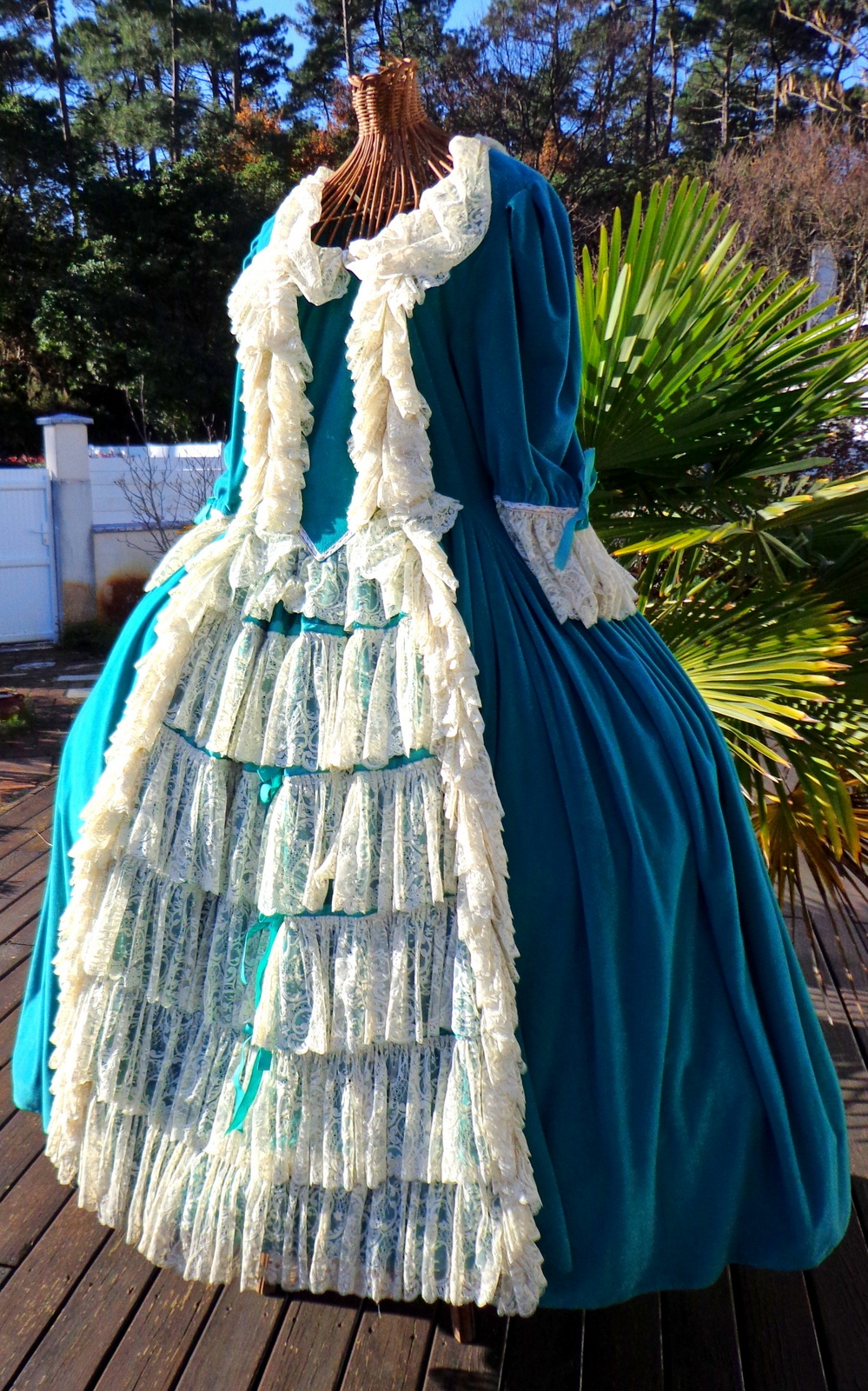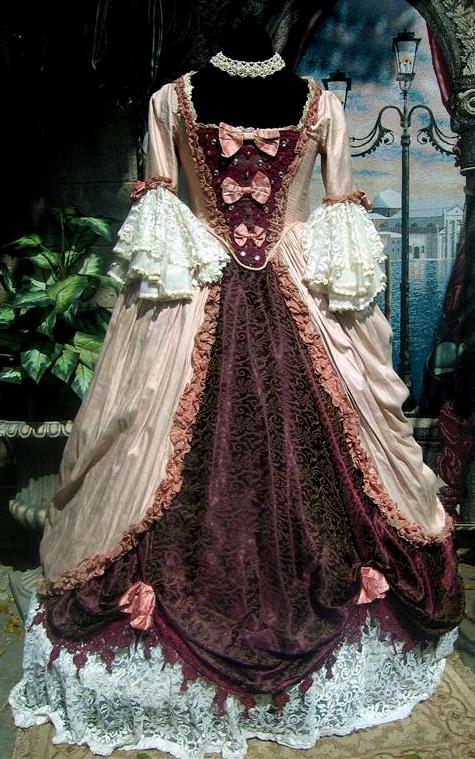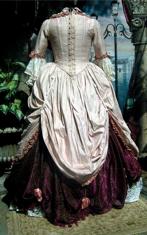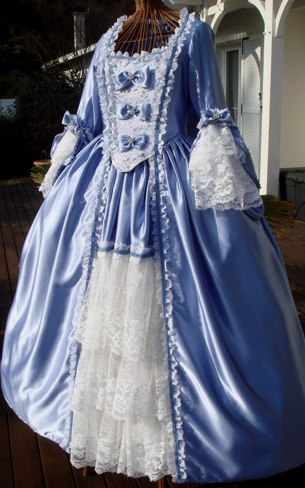Vu le prix de la location d’un beau costume sur Venise, j’ai préféré en acheter un. J’ai fouillé le web dans tous les sens en français et en anglais et j’ai fini par trouver ce que je cherchais: une robe Marie-Antoinette de style 18ème qui semblait être « historiquement correcte ». C’est une costumière d’Hollywood qui vendait une robe de cinéma via Ebay aux Etats-Unis. Après quelques échanges, elle a accepté de me la vendre et de me l’expédier en France.