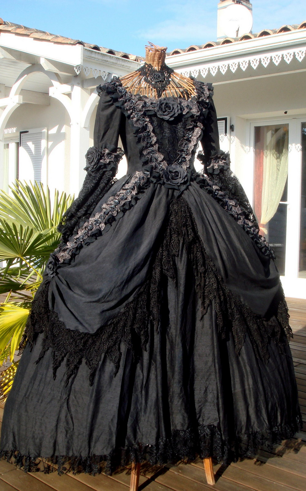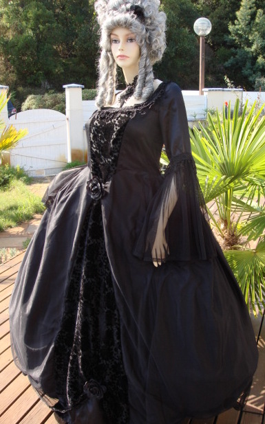 Mon compagnon étant en noir et ayant toujours eu un goût prononcé pour le style gothique que je trouve très élégant, j’ai donc recherché une Marie-Antoinette noire pour l’assortir à son costume. Je me suis axée plus précisément dans mes recherches sur les robes de veuvage mais la seule qui aurait pu convenir (photo ci-dessus) n’était pas assez ample pour être portée sur la crinoline ovale à paniers de l’autre robe.
