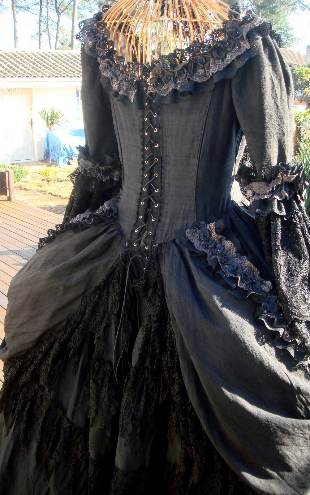 On l’a teinte en noir, on a démonté puis remonté les manches, enlevé la fermeture éclair dans le dos pour la remplacer par des œillets (vendus en bande chez les fournisseurs de corsetterie et les merceries ex ALYSSE CREATIONS, MA FASHION MERCERIE) et un cordon de laçage, ajouté des « kilomètres de dentelle noire et des centaines de roses noires en soie et comme vous pourrez le constatez sur les photos, le résultat était spectaculaire !!!