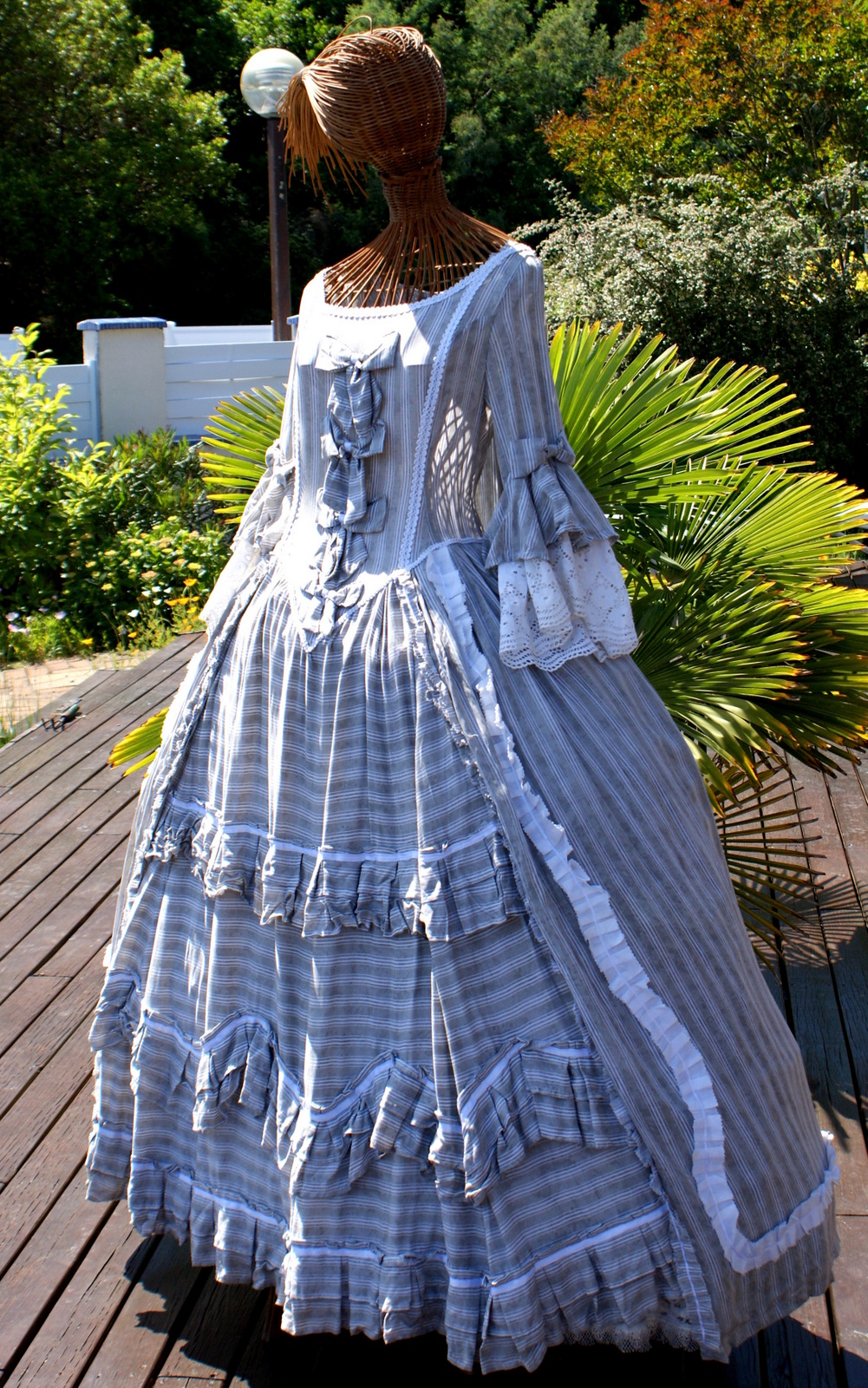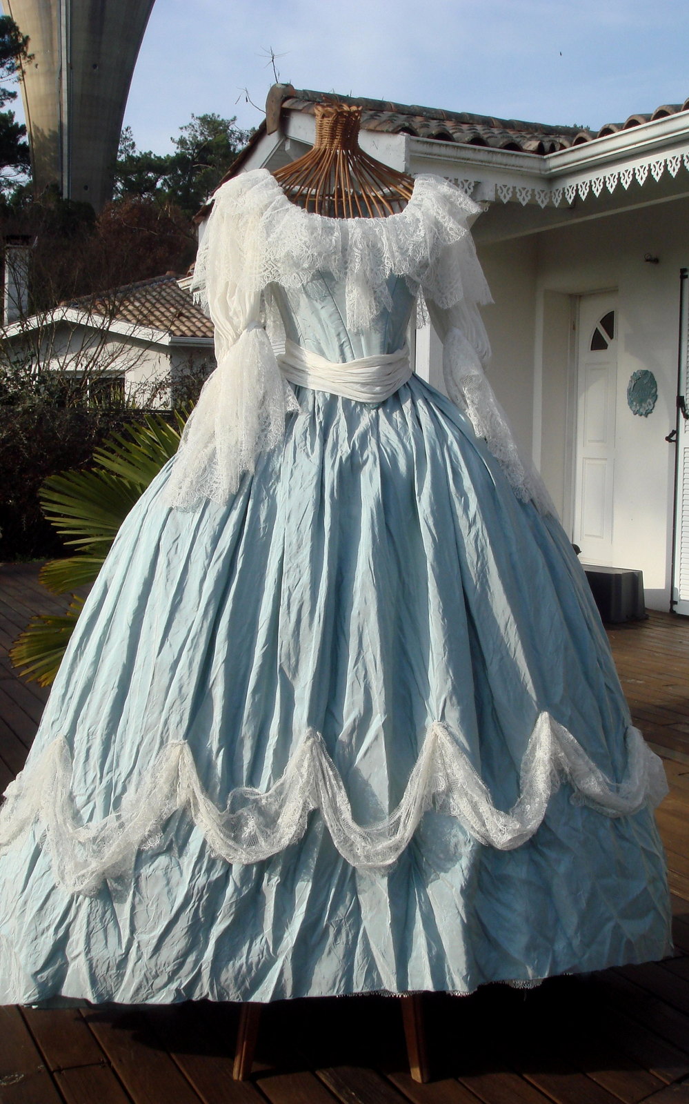Je dois préciser que ce n’était pas la première robe que j’ai achetée mais plutôt la 8ème !!! Elles étaient toutes belles, en provenance d’Allemagne, d’Angleterre ou des Etats-Unis mais elles étaient ou trop grandes ou trop petites ou pas de la période historique que je recherchais (certaines étaient pourtant de vraies pièces de musée !) alors je les revendais aussitôt sur Ebay. Aucune n’est restée en vente plus d’une semaine tellement elles sont rares et recherchées !!!