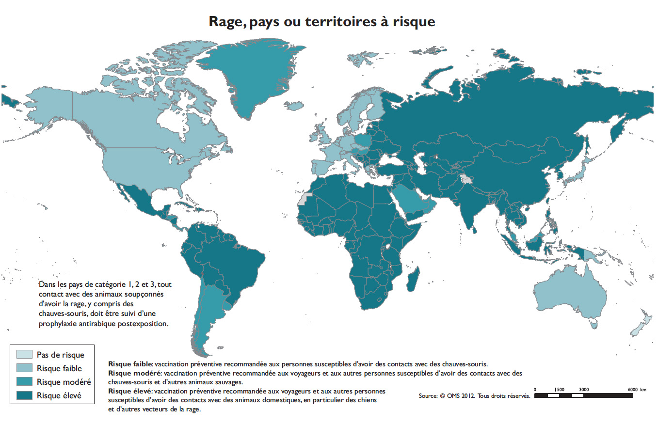 La rage est présente sur tous les continents sauf l’Antarctique comme le montre la carte ci-dessous…