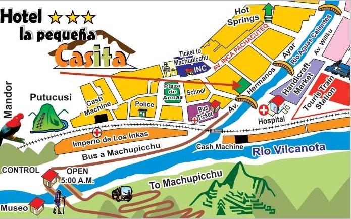 A la sortie de la gare d’AGUAS CALLIENTES, on se retrouve directement dans un marché artisanal qu’il faut entièrement traverser. Heureusement, notre guide francophone du lendemain est là pour nous montrer le chemin et nous emmener à notre hôtel. Nous dormons à l’hôtel CASA DE LUZ (anciennement LA PEQUENA CASITA) (62$ la chambre simple, 72$ la double en pension complète). Ne pas oublier la partie inférieure de la TAM (Tarjeta Andina de Migración) que l’on a rempli en arrivant au Pérou, sinon c’est 18% de taxes supplémentaires !!! Photocopie du passeport au check-in.