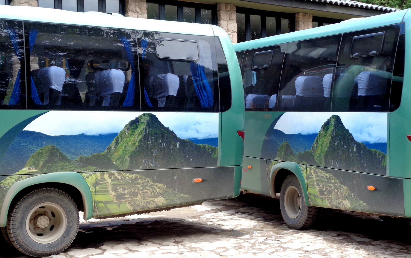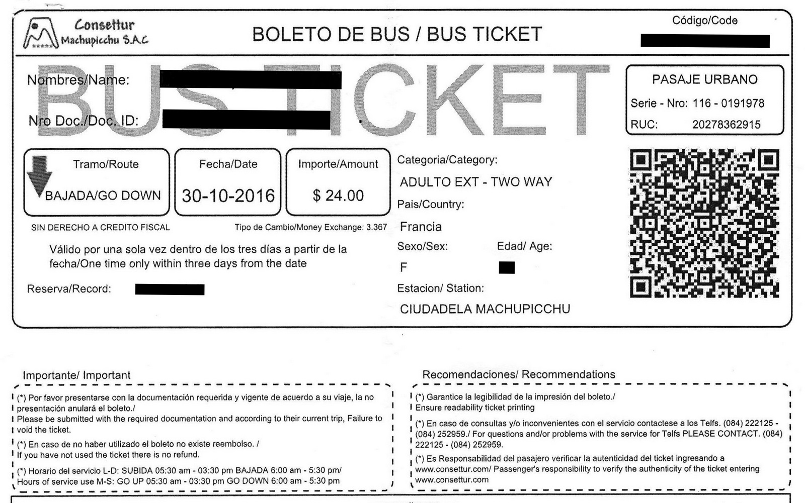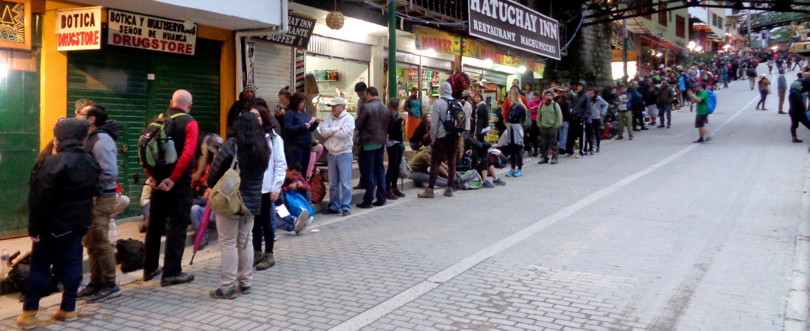 Après un stop juste à la sortie pour tamponner notre passeport d’un magnifique « timbre » souvenir Machu Picchu et un sandwich dans un des 2 snacks de l’entrée, nous revoilà dans la queue du bus pour redescendre sur AGUAS CALIENTES. On peut attendre jusqu’à 1h30 pour embarquer alors il faut prendre son mal en patience !!!