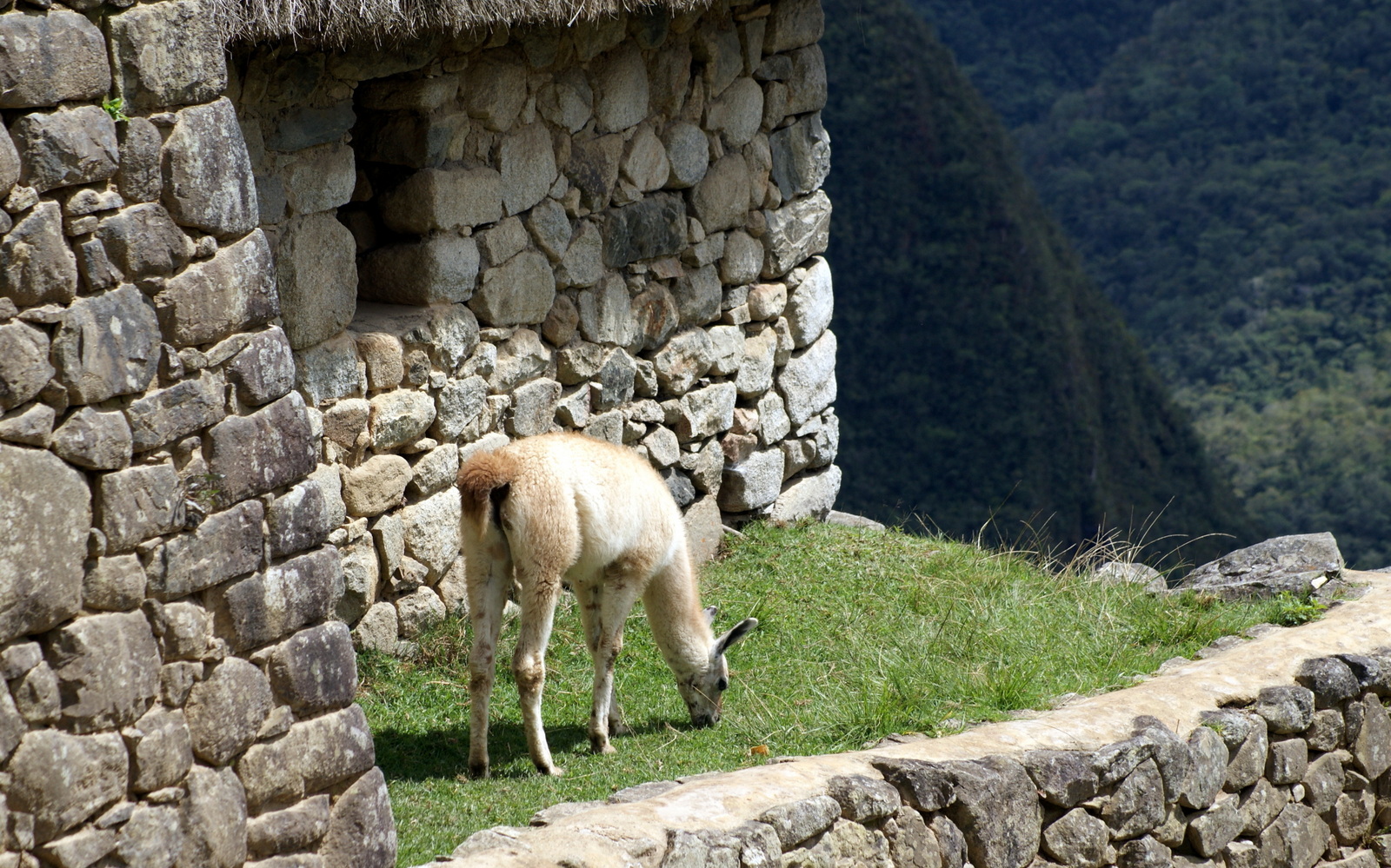 C’est en redescendant par les terrasses que l’on croise le plus de lamas. Ils vivent librement sur le site et sont utilisés comme tondeuses naturelles car ils broutent sans arracher l’herbe. Ils ne sont pas farouches mais visiblement, on ne les intéresse pas beaucoup!!!…