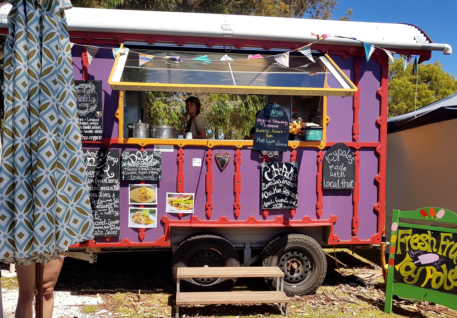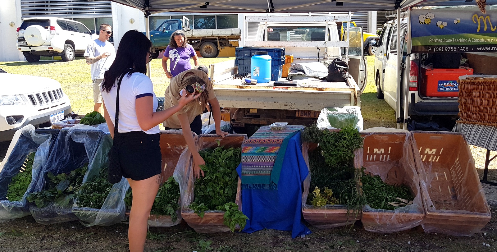 On a beau être le samedi 26 janvier, jour de l’Australia Day (la fête nationale australienne), le marché bat son plein. On découvre avec bonheur des étals de fruits et légumes aussi nombreux que variés. J’hallucine devant les brassées d’herbes aromatiques: basilic, persil, coriandre… vendues à 1 AU$! Je réussis à acheter le dernier fromage de chèvre d’une suisse-allemande qui qui me raconte qu’elle n’arrive pas à produire autant que la demande…